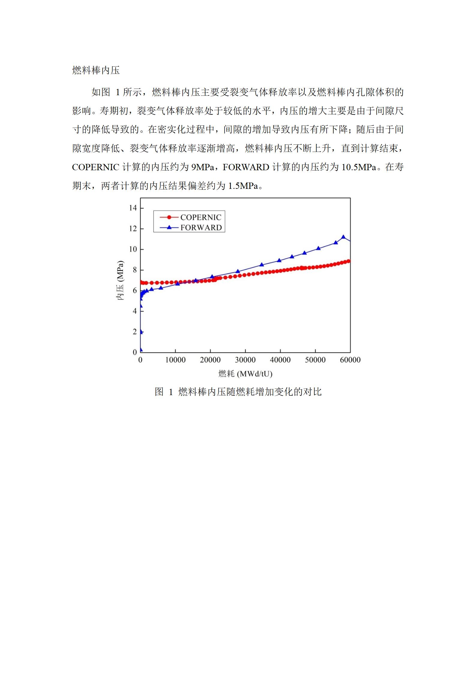 As shown in Figure 1, the internal pressure of the fuel rod is mainly affected by the release rate of fission gas and the pore volume in the fuel rod. At the beginning of life, the release rate of fission gas is at a low level, and the increase of internal pressure is mainly due to the reduction of gap size. In the process of densification, the increase of gap leads to the decrease of internal pressure; Subsequently, as the gap width decreases and the fission gas release rate gradually increases, the internal pressure of the fuel rod keeps rising until the end of the calculation. The internal pressure calculated by COPERNIC is about 9MPa, and the internal pressure calculated by FORWARD is about 10.5MPa. At the end of the service life, the deviation of the calculated internal pressure between the two is about 1.5MPa.