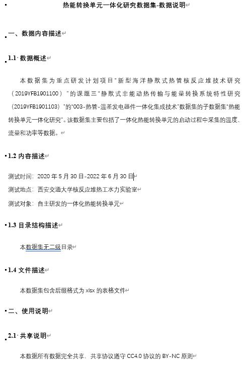 This data set is the database sub data "2019YFB1901103-003 - integrated research data set of thermal energy conversion unit" of the third "Research on characteristics of silent passive heat transfer and energy conversion system (2019YFB1901103)" of the key R & D plan project "Research on new marine silent heat pipe nuclear reactor technology (2019YFB1901100)", It mainly includes the temperature, flow and power data collected during the startup of the integrated thermal energy conversion unit.