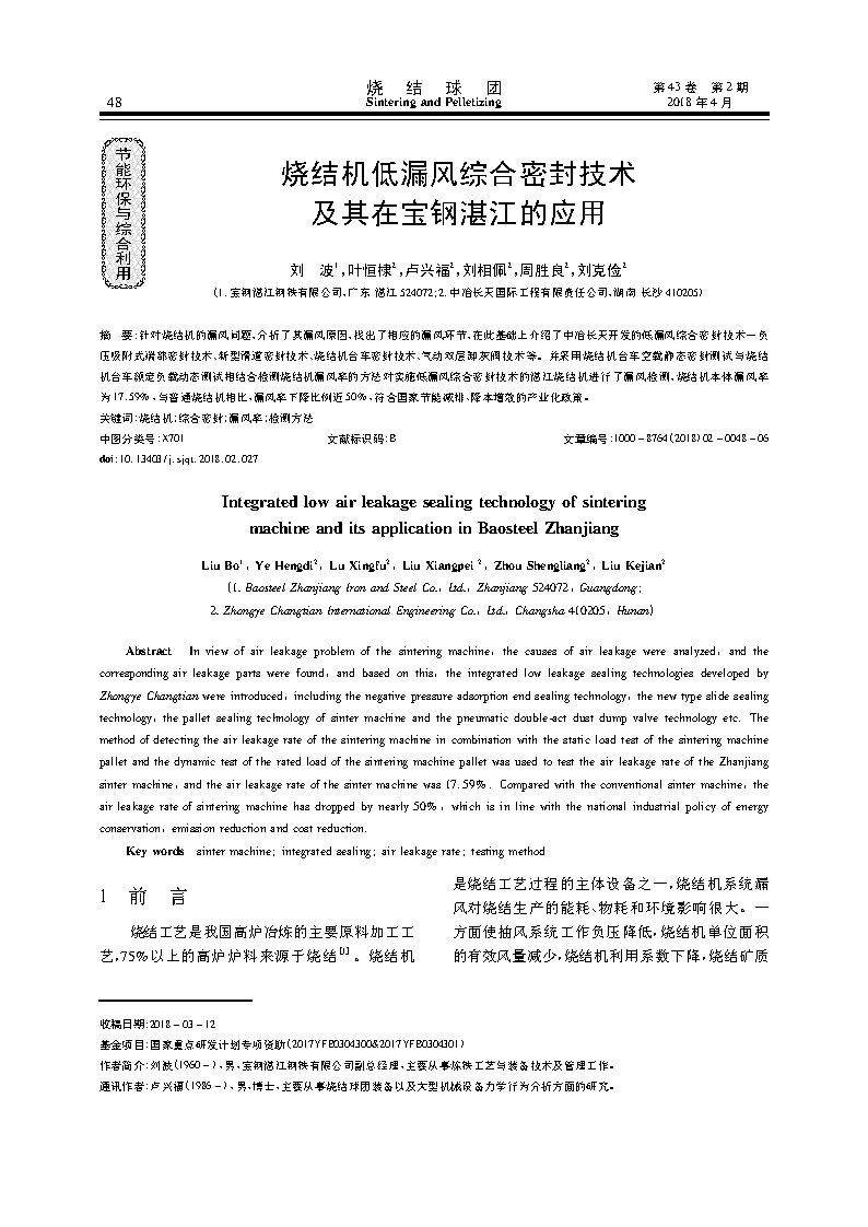 针对烧结机的漏风问题, 分析了其漏风原因, 找出了相应的漏风环节, 在此基础上介绍了中冶长天开发的低漏风综合密封技术—负压吸附式端部密封技术、新型滑道密封技术、烧结机台车密封技术、气动双层卸灰阀技术等。并采用烧结机台车空载静态密封测试与烧结机台车额定负载动态测试相结合检测烧结机漏风率的方法对实施低漏风综合密封技术的湛江烧结机进行了漏风检测, 烧结机本体漏风率为 17. 59% , 与普通烧结机相比, 漏风率下降比例近 50% , 符合国家节能减排、降本增效的产业化政策。