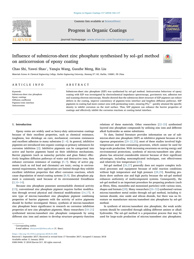 Submicron-sheet zinc phosphate (SZP) was synthesised by sol–gel method. Anticorrosion behaviour of epoxy coating with SZP was investigated by electrochemical impedance spectroscopy, gravimetric test, adhesion test and scanning electron microscopy. Results showed that the submicron-sheet structure of SZP pigment can reduce defects in the coating, improve consistency of pigment/resin interface and lengthen diffusion pathways. SZP pigments in coating had more contact area with permeating water, ensuring PO43− quickly attained the specific density to inhibit corrosion on the steel surface. Thus, SZP pigment can enhance the barrier properties of coatings and effectively inhibit the corrosion reactions at coating/metal interface.