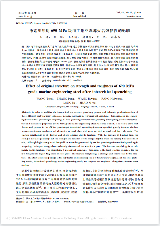 The temperature drop curves of an ultra-heavy plate with a thickness of 137 mm after quenching are measured at different positions using a jet quenching equipment and a multi-channel steel plate temperature recorder. The effect of the jet impact (Z1), intersection interference (Z2), and transverse flow (Z3) heat transfer zones on the temperature gradient of an ultra-heavy steel plate during jet quenching was investigated. The corresponding relationships and interaction mechanisms between cooling rate, microstructure, and mechanical properties during jet quenching are studied. The results indicate that Z2 and Z3 had a greater influence on temperature gradient and microstructure evolution, and Z1 and Z2 had a greater influence on the cooling rate and mechanical properties. The experimental results have guiding significance for the development of new quenching equipment for ultra-heavy steel plates and their industrial application.