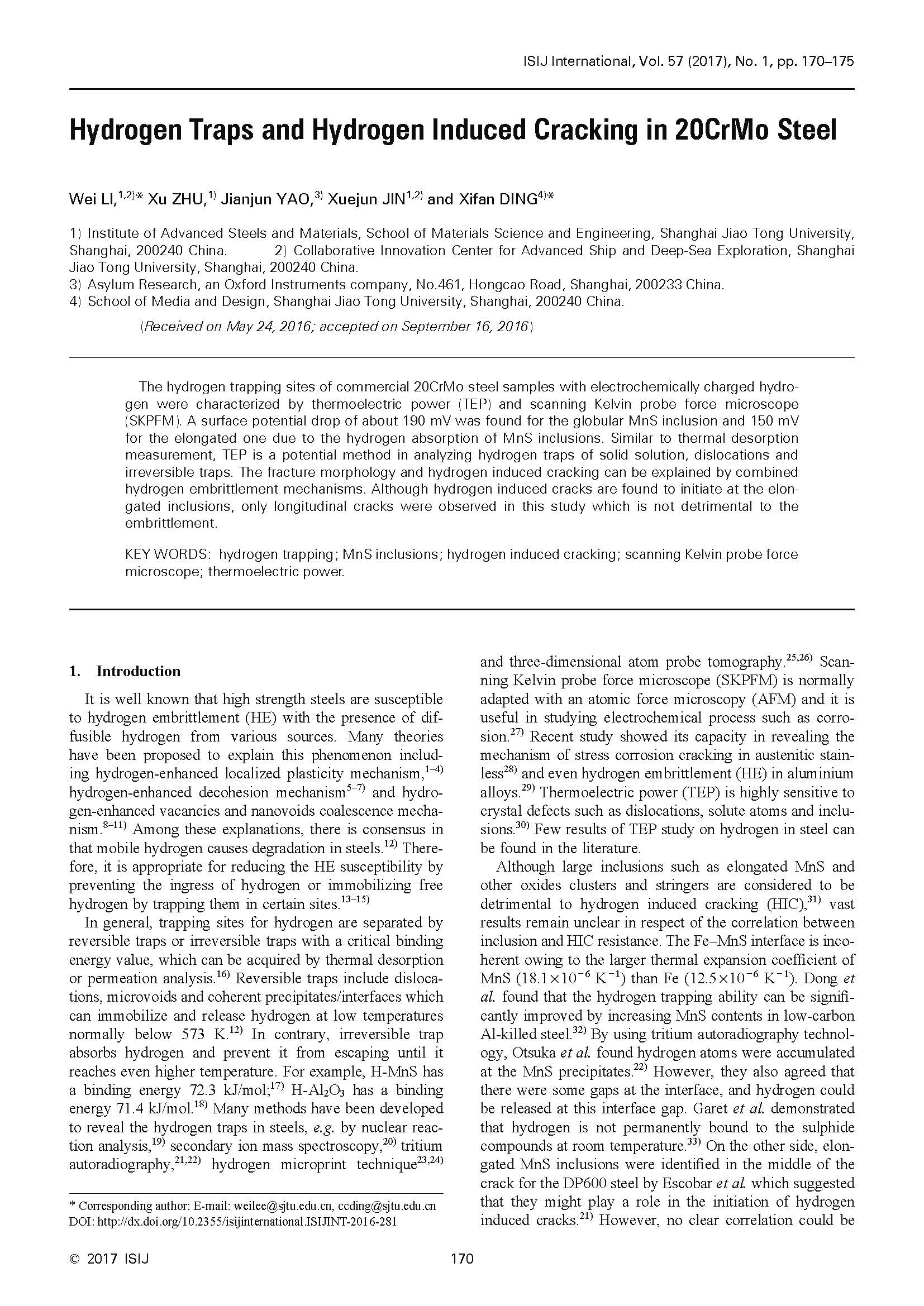 The hydrogen trapping sites of commercial 20CrMo steel samples with electrochemically charged hydrogen were characterized by thermoelectric power (TEP) and scanning Kelvin probe force microscope (SKPFM). A surface potential drop of about 190 mV was found for the globular MnS inclusion and 150 mV for the elongated one due to the hydrogen absorption of MnS inclusions. Similar to thermal desorption measurement, TEP is a potential method in analyzing hydrogen traps of solid solution, dislocations and irreversible traps. The fracture morphology and hydrogen induced cracking can be explained by combined hydrogen embrittlement mechanisms. Although hydrogen induced cracks are found to initiate at the elongated inclusions, only longitudinal cracks were observed in this study which is not detrimental to the embrittlement.