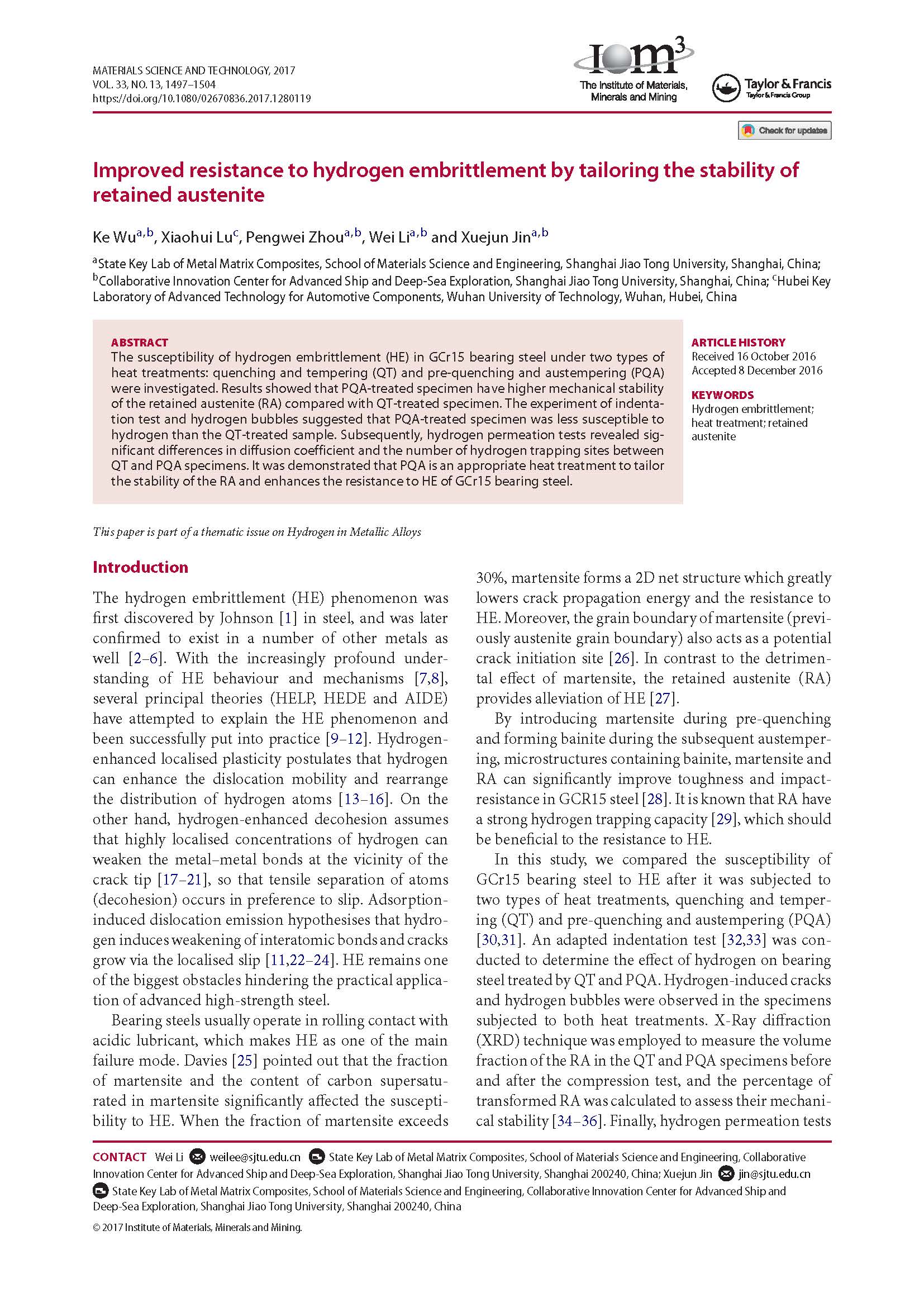 The susceptibility of hydrogen embrittlement (HE) in GCr15 bearing steel under two types of heat treatments: quenching and tempering (QT) and pre-quenching and austempering (PQA) were investigated. Results showed that PQA-treated specimen have higher mechanical stability of the retained austenite (RA) compared with QT-treated specimen. The experiment of indentation test and hydrogen bubbles suggested that PQA-treated specimen was less susceptible to hydrogen than the QT-treated sample. Subsequently, hydrogen permeation tests revealed significant differences in diffusion coefficient and the number of hydrogen trapping sites between QT and PQA specimens. It was demonstrated that PQA is an appropriate heat treatment to tailor the stability of the RA and enhances the resistance to HE of GCr15 bearing steel.
