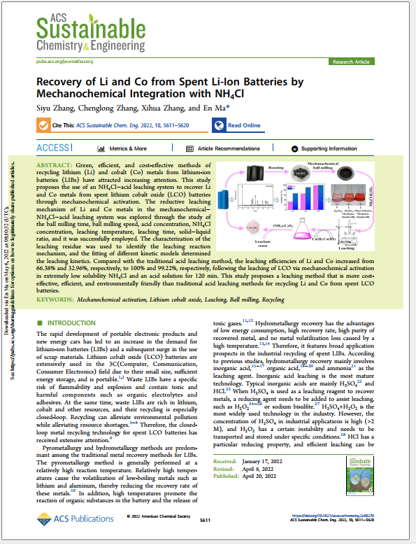 从锂离子电池(LIBs)中回收锂(Li)和钴(Co)金属的绿色、高效和成本效益高的方法越来越受到关注。本研究提出使用NH4Cl−酸浸出系统,通过机械化学活化从废锂钴氧化物(LCO)电池中回收Li和Co金属。通过对球磨时间、球磨速度、酸浓度、NH4Cl浓度、浸出温度、浸出时间、固液比的研究,探讨了机械化学−NH4Cl−酸浸出体系中Li和Co金属的还原浸出机理,并成功应用。利用浸出渣的表征来确定浸出反应机理,不同动力学模型的拟合确定了浸出动力学。与传统的酸浸方法相比,在极低溶解度的NH4Cl和酸溶液中通过机械化学活化浸出LCO 120分钟后,Li和Co的浸出效率分别从66.38%和32.96%提高到100%和99.22%。本研究提出了一种更具成本效益、更高效的浸出方法,并且比从用过的LCO电池中回收Li和Co的传统酸浸方法更环保。