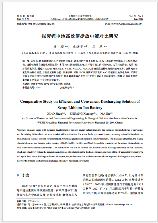 近年来, 随着新能源汽车产业的快速发展, 锂电池的产量不断增长, 市场上现有的锂电池若干年后将要退役。退役锂电池在资源化回收过程中多用 NaCl 溶液浸泡放电, 对环境有很大的污染风险。为了探究清洁、高效、经济的放电体系, 通过对比实验, 研究 NaCl、 NaOH、 Na2SO4、 Na2CO3 溶液浸泡退役锂电池的放电效率、金属元素和氟化物的释放情况, 以及重复利用性能。结果表明, 采用 NaOH 溶液可以实现和 NaCl 溶液相似的放电效率, 可以有效减少放电过程中污染物的产生和释放, 将电解液泄露产生的 HF 大部分固定于放电溶液中。而且, 经多次重复放电性能未见衰减, 工业应用前景较大。