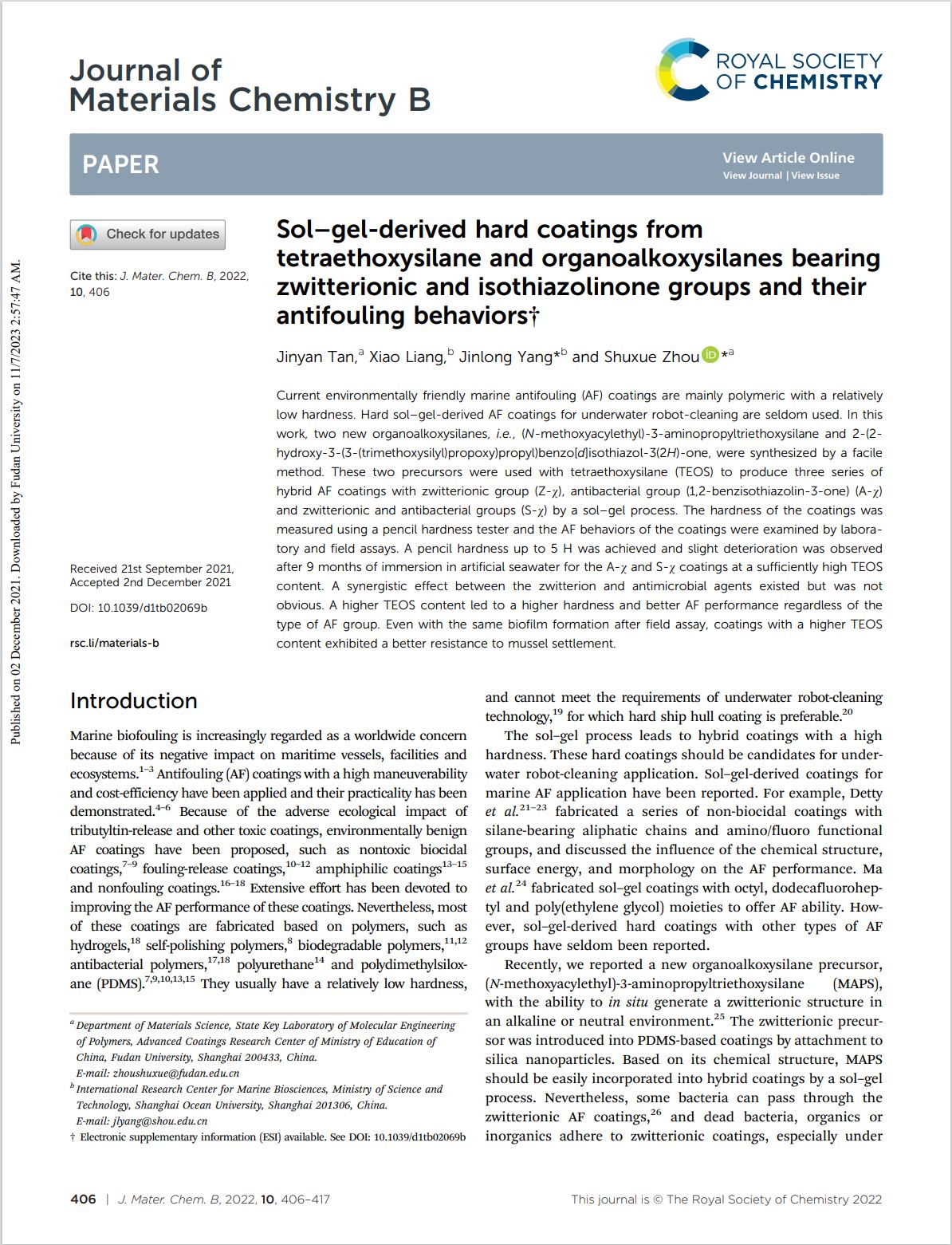 目前环保型海洋防污(AF)涂料以硬度相对较低的聚合物为主。用于水下机器人清洁的硬溶胶凝胶衍生的AF涂层很少使用。本工作采用简单方法合成了(N-甲氧基酰乙基)-3-氨丙基三乙氧基硅烷和2-(2-羟基-3-(3-(三甲氧基硅基)丙氧基)丙基)苯并[d]异噻唑-3(2H)-酮两种新型有机烷氧基硅烷。这两种前驱体与四乙氧基硅烷一起使用(TEOS)通过溶胶-凝胶工艺生产两性离子基团(Z-chi)、抗菌基团(1,2-苯并异噻唑啉-3-酮)(A-chi)和两性离子和抗菌基团(S-chi)三个系列的混合AF涂层。使用铅笔硬度计测量涂层的硬度,并通过实验室和现场测定检查涂层的AF行为。铅笔硬度达到5 H,在足够高的TEOS含量下,A-chi和S-chi涂层在人工海水中浸泡9个月后观察到轻微劣化。两性离子和抗菌剂之间存在协同作用,但并不明显。较高的TEOS含量导致更高的硬度和更好的AF性能,无论AF组的类型如何。即使在田间测定后形成相同的生物膜,具有较高TEOS含量的涂层也表现出更好的抗贻贝沉降能力。