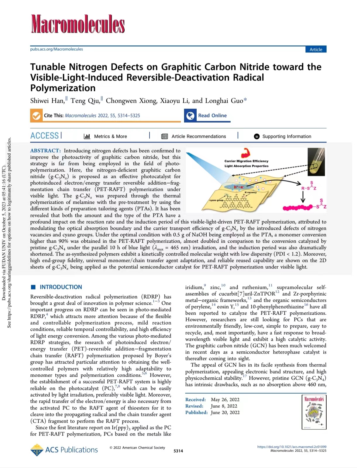 引入氮缺陷已被证实可以提高石墨氮化碳的光活性,但这种策略远未用于光聚合领域。本文提出了在可见光下进行链转移(PET-RAFT)聚合的缺氮石墨氮化碳(g-C3Nx)。以三聚氰胺为原料,采用不同的制备裁剪剂(PTAs)进行预处理,通过热聚合制备了g-C3Nx。研究表明,PTA的量和类型对这种可见光驱动的PET-RAFT聚合的反应速率和诱导期都有深远的影响,这归因于氮空位和氰基的引入缺陷调节了g-C3Nx的光吸收边界和载流子传输效率。在使用0.5g NaOH作为PTA的最佳条件下,在平行10h蓝光(Amax=465nm)照射下,PET-RAFT聚合中获得了高于90%的单体转化率,与原始g-C3Nx催化的转化率相比几乎翻了一番,并且诱导期也显著缩短。合成的聚合物具有低分散性(PDI<1.2)的动力学控制分子量。此外,g-C3Nx的2D片上显示出高的端基保真度、通用的单体/链转移剂适应性和可靠的重复使用能力,可作为可见光下PET-RAFT聚合的潜在半导体催化剂。