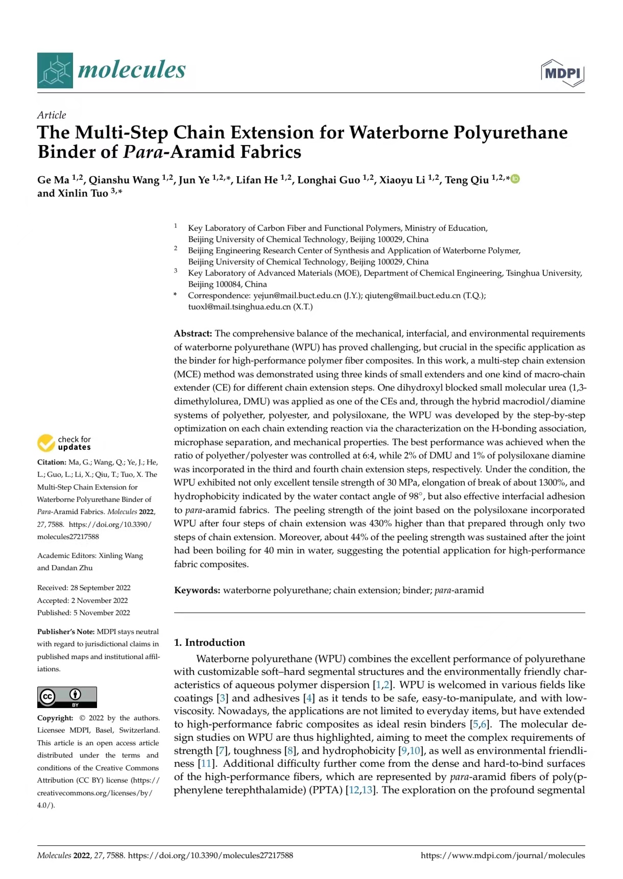 事实证明,水性聚氨酯(WPU)在机械、界面和环境要求之间的综合平衡具有挑战性,但在作为高性能聚合物纤维复合材料粘合剂的具体应用中至关重要。在这项工作中,针对不同的扩链步骤,使用三种小型扩链剂和一种大型扩链剂演示了一种多步骤扩链(MCE)方法。将一种二羟基封端的小分子脲(1,3-二甲基甲苯脲,DMU)用作CE之一,并通过聚醚、聚酯和聚硅氧烷的大分子二醇/二胺混合体系,通过对氢键缔合、微相分离和机械性能的表征,对每个扩链反应进行逐步优化,开发出WPU。当聚醚/聚酯的比例控制在6:4,同时在第三和第四扩链步骤中分别加入2%的DMU和1%的聚硅氧烷二胺时,获得了最佳性能。在该条件下,WPU不仅表现出30MPa的优异拉伸强度、1300%的断裂伸长率和98°的疏水性,而且与对位芳纶织物具有有效的界面粘附性。基于掺入聚硅氧烷的WPU的接头在四步扩链后的剥离强度比仅通过两步扩链制备的接头的剥离强度高430%。此外,在接头在水中沸腾40分钟后,约44%的剥离强度得以保持,这表明高性能织物复合材料具有潜在的应用前景。