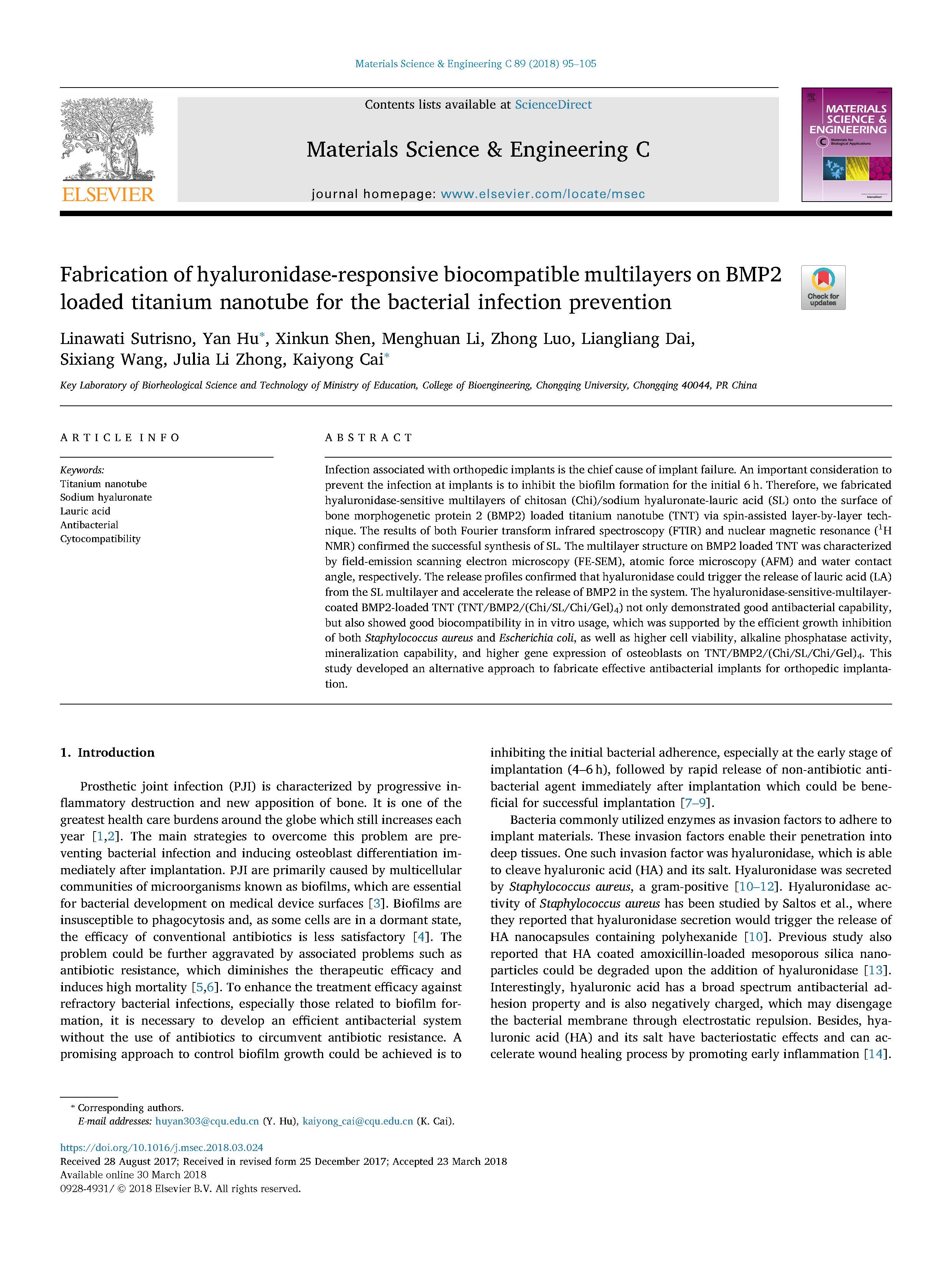 与骨科植入物相关的感染是植入物失败的主要原因。防止植入物感染的一个重要考虑因素是在最初的 6 小时内抑制生物膜的形成。因此,我们通过自旋辅助逐层技术在载有骨形态发生蛋白 2 (BMP2) 的钛纳米管 (TNT) 的表面上制备了壳聚糖 (Chi)/透明质酸钠-月桂酸 (SL) 的透明质酸酶敏感多层膜。傅里叶变换红外光谱 (FTIR) 和核磁共振 (H-1 NMR) 的结果证实了 SL 的成功合成。加载 BMP2 的 TNT 上的多层结构分别通过场发射扫描电子显微镜 (FE-SEM)、原子力显微镜 (AFM) 和水接触角表征。释放曲线证实透明质酸酶可以触发月桂酸 (LA) 从 SL 多层释放并加速系统中 BMP2 的释放。透明质酸酶敏感多层包被的 BMP2 负载 TNT (TNT/BMP2/(Chi/SL/Chi/Gel)(4)) 不仅表现出良好的抗菌能力,而且在体外使用中也表现出良好的生物相容性,这得到了支持通过有效抑制金黄色葡萄球菌和大肠杆菌的生长,以及更高的细胞活力、碱性磷酸酶活性、矿化能力以及成骨细胞在 TNT/BMP2/(Chi/SL/Chi/Gel)(4) 上的更高基因表达.这项研究开发了一种替代方法来制造用于骨科植入的有效抗菌植入物。