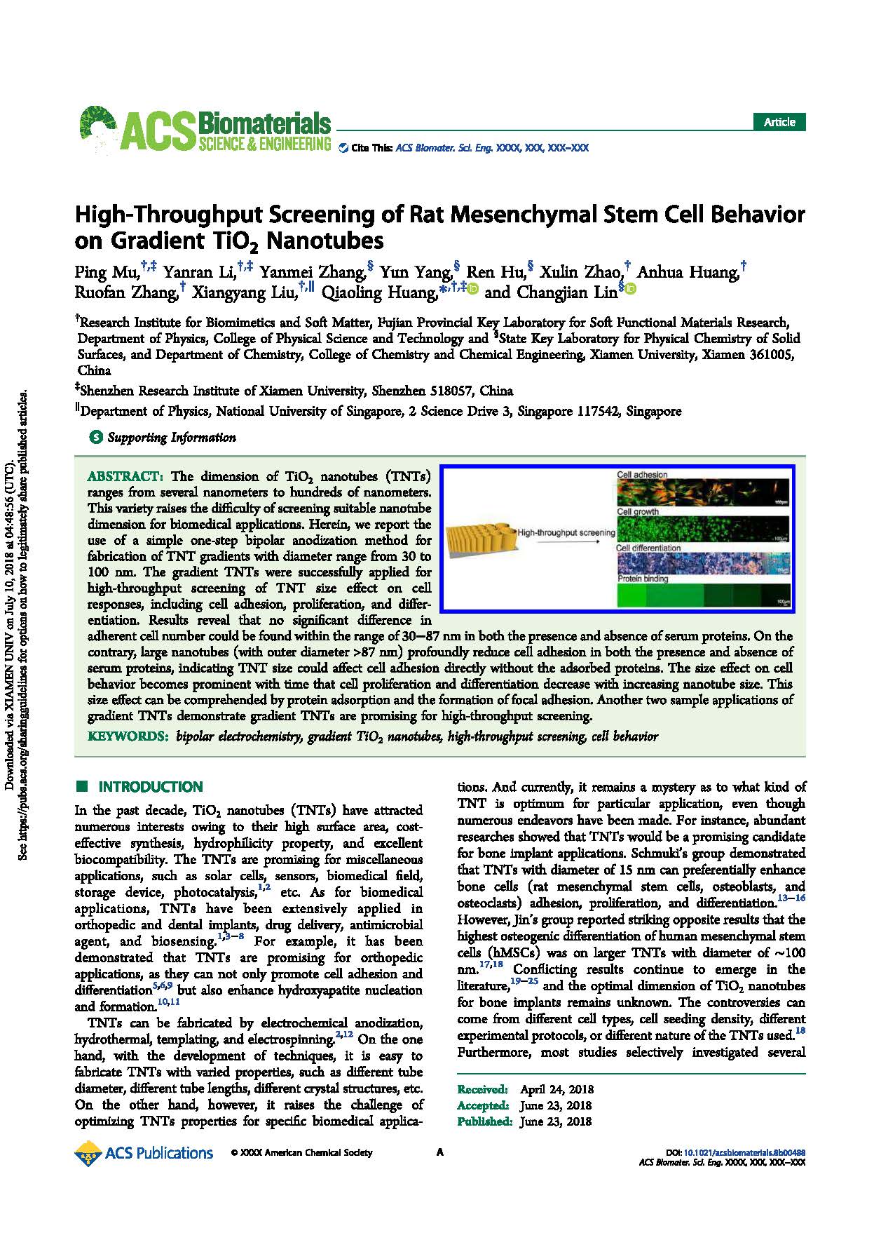 TiO2纳米管(TNTs)的尺寸范围从几纳米到几百纳米。这种多样性增加了筛选适合于生物医学应用的纳米管尺寸的难度。本文中,我们报导了一种简单的一步双极阳极氧化方法制造直径范围为30到100 nm的梯度TNTs。梯度TNTs成功应用于高通量筛选纳米管的尺寸对细胞反应的影响,包括细胞粘附、增殖和分化。结果表明,无论是否存在血清蛋白,在30-87 nm范围内贴壁细胞数量并没有显着差异。相反,无论是否有血清蛋白的存在,大管径的纳米管(外径 >87 nm)都会显著降低细胞粘附,这表明即使没有吸附蛋白,纳米管的尺寸也会直接影响细胞粘附。随着时间的推移,纳米管尺寸对细胞行为的影响变得更突出,即细胞增殖和分化随着纳米管的尺寸的增加而降低。这种尺寸效应可以通过蛋白质吸附和粘着斑的形成来理解。梯度纳米管的另外两个示例应用表明梯度纳米管有望用于高通量筛选。