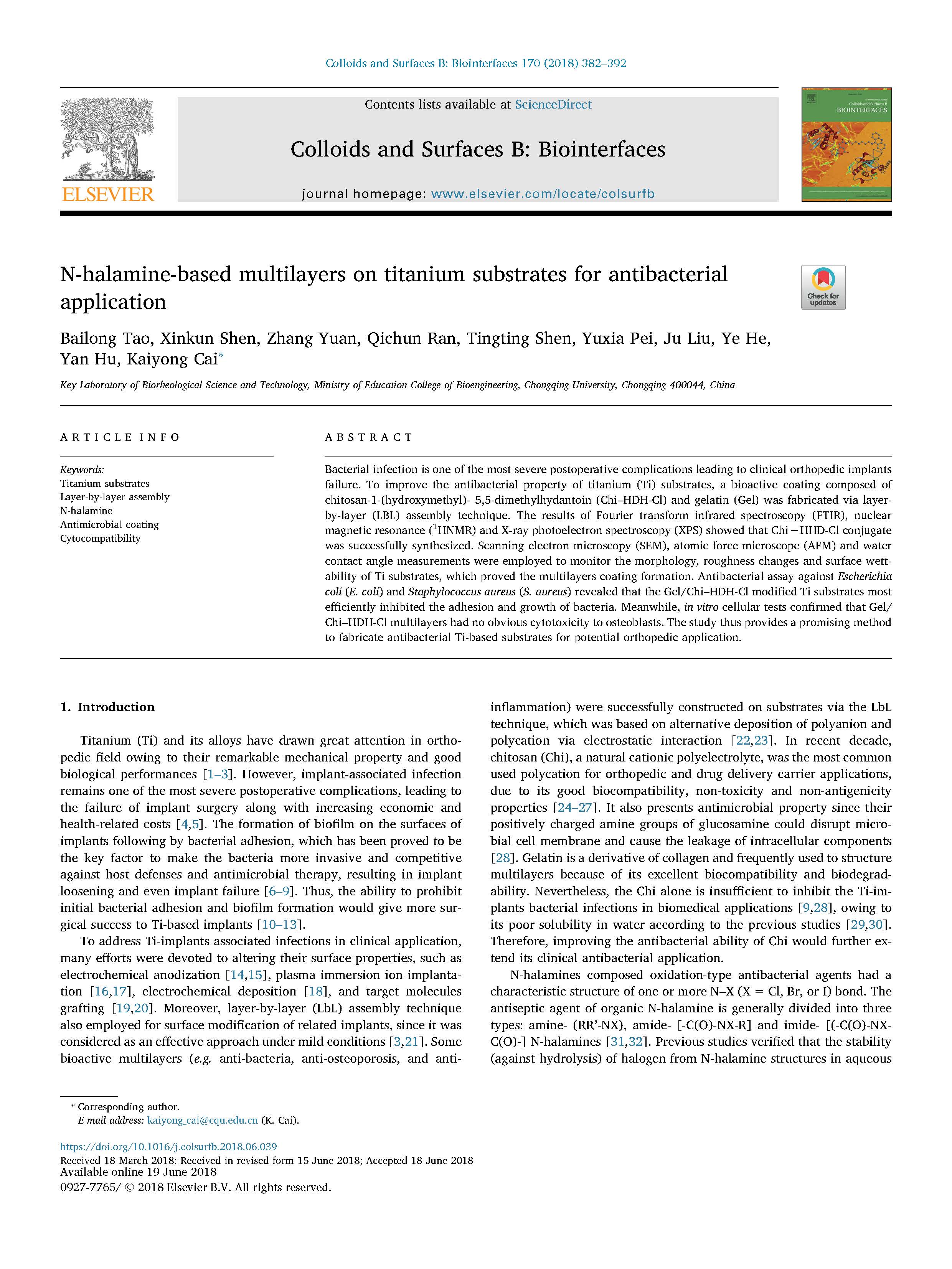 细菌感染是导致临床骨科植入物失败的最严重的术后并发症之一。为了提高钛(Ti)基材的抗菌性能,通过逐层制备由壳聚糖-1-(羟甲基)-5,5-二甲基乙内酰脲(Chi-HDH-Cl)和明胶(Gel)组成的生物活性涂层(LBL) 组装技术。傅里叶变换红外光谱(FTIR)、核磁共振((HNMR)-H-1)和X射线光电子能谱(XPS)结果表明,成功合成了Chi-HHD-Cl共轭物。采用扫描电子显微镜 (SEM)、原子力显微镜 (AFM) 和水接触角测量来监测 Ti 基体的形貌、粗糙度变化和表面润湿性,证明了多层涂层的形成。针对大肠杆菌(E.coli)和金黄色葡萄球菌(S.aureus)的抗菌试验表明,Gel/Chi-HDH-Cl 修饰的 Ti 底物最有效地抑制了细菌的粘附和生长。同时,体外细胞试验证实Gel/Chi-HDH-Cl多层膜对成骨细胞没有明显的细胞毒性。因此,该研究为制造用于潜在骨科应用的抗菌钛基基材提供了一种有前景的方法。