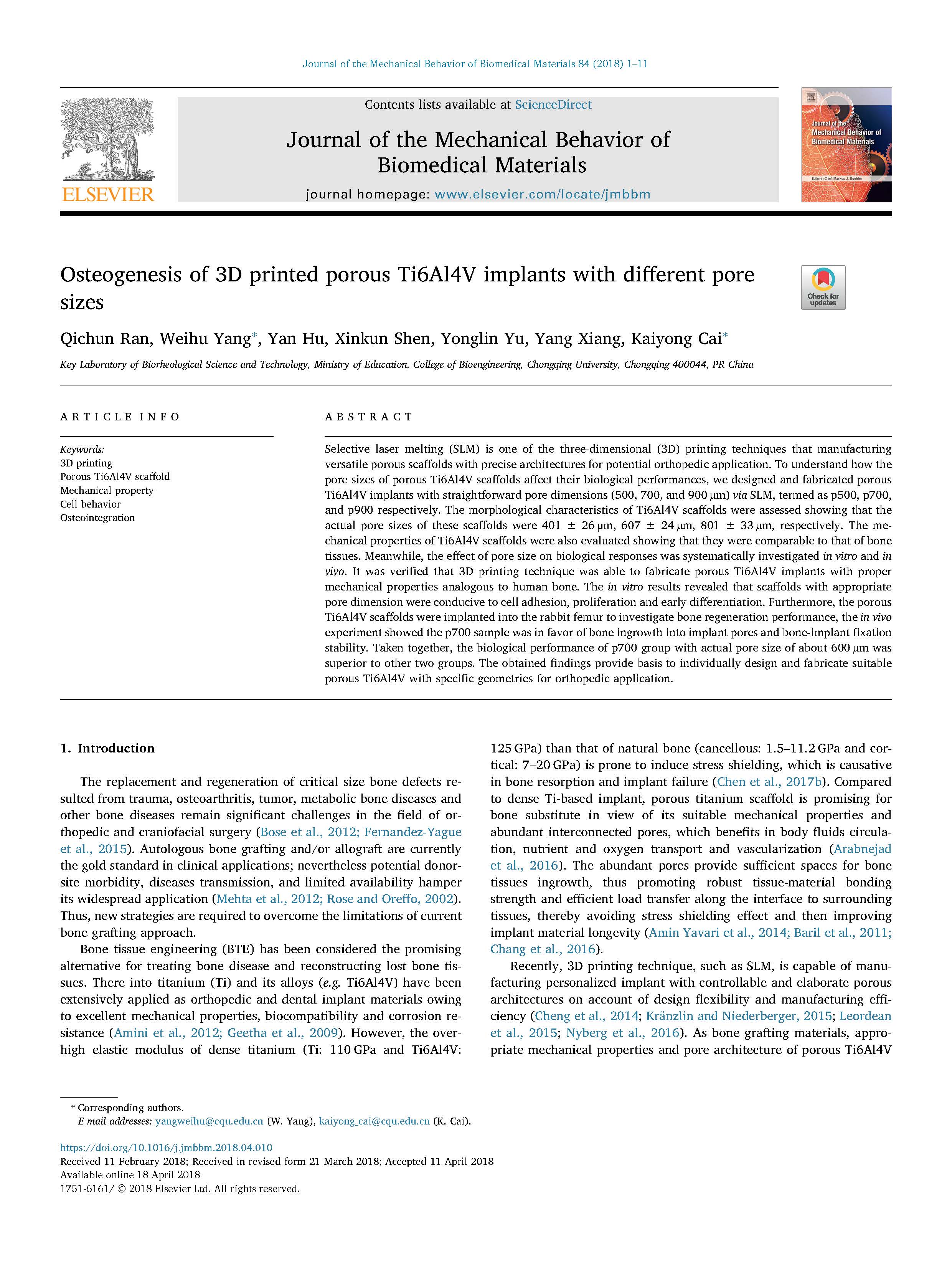 选择性激光熔融(SLM)是一种三维(3D)打印技术,制造多功能多孔支架与精确的结构,为潜在的骨科应用。为了了解多孔Ti6Al4V支架的孔径如何影响其生物性能,我们通过SLM设计和制造了多孔孔径(500、700和900µm),分别称为p500、p700和p900。对Ti6Al4V支架的形态学特征进行了评估,结果表明,这些支架的实际孔径分别为401±26µm、607±24µm、801±33µm。还评估了Ti6Al4V支架的力学性能,表明其与骨组织相当。同时,系统地研究了孔径对体外和体内生物反应的影响。结果证明,三维打印技术能够制造出具有类似于人骨的适当力学性能的多孔Ti6Al4V植入物。体外实验结果表明,具有适当孔隙尺寸的支架有利于细胞粘附、增殖和早期分化。此外,将多孔Ti6Al4V支架植入兔股骨以研究骨再生性能,体内实验表明p700样本有利于骨进入植入孔和植入骨固定稳定性。综上所述,实际孔径约为600µm的p700组的生物性能优于其他两组。所获得的发现为单独设计和制造具有特定几何形状的矫形应用的合适多孔Ti6Al4V提供了基础。