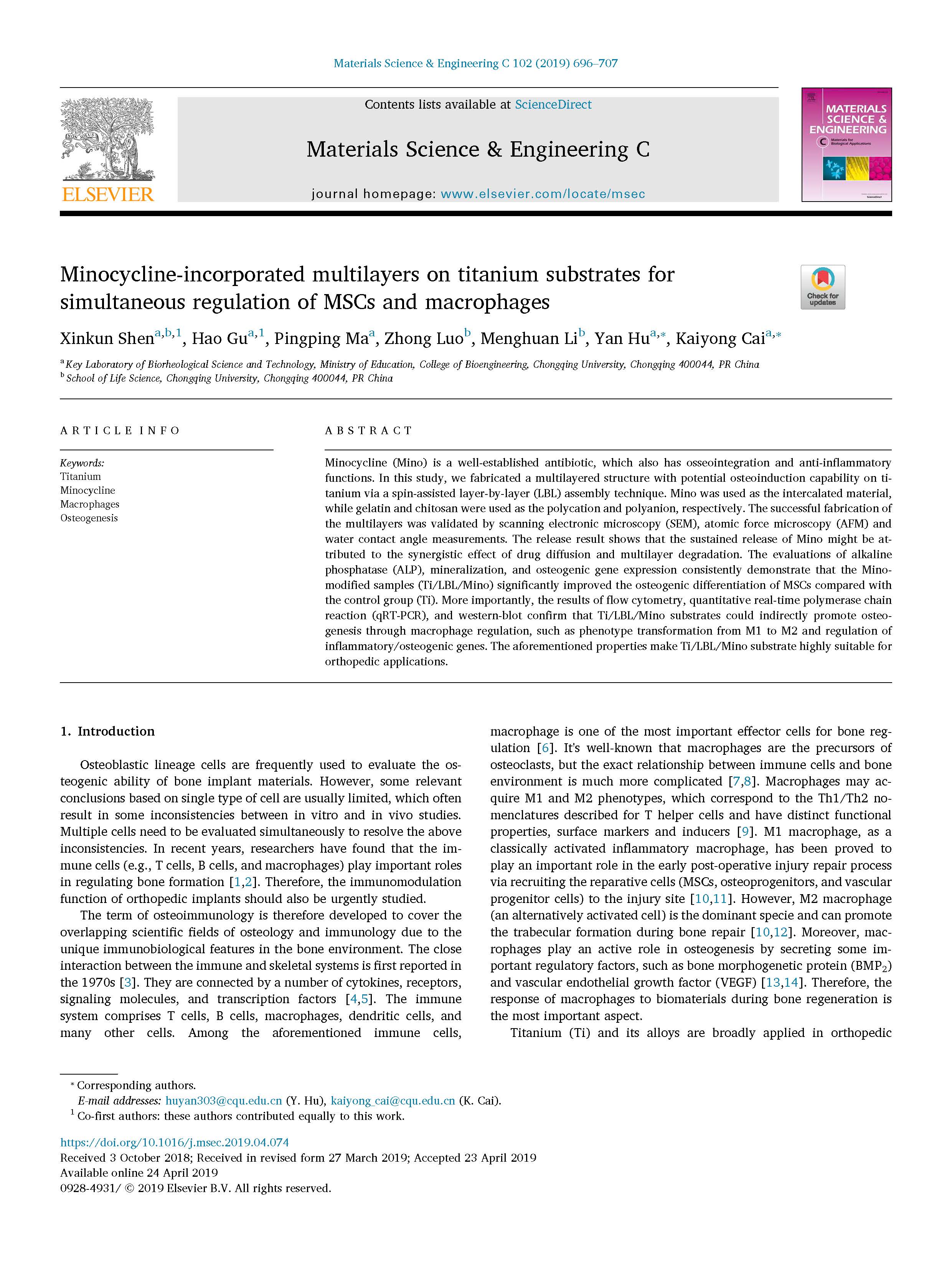 米诺环素 (Mino) 是一种成熟的抗生素,还具有骨整合和抗炎功能。在这项研究中,我们通过自旋辅助逐层 (LBL) 组装技术在钛上制造了具有潜在骨诱导能力的多层结构。 Mino用作嵌入材料,而明胶和壳聚糖分别用作聚阳离子和聚阴离子。通过扫描电子显微镜 (SEM)、原子力显微镜 (AFM) 和水接触角测量验证了多层膜的成功制造。释放结果表明,Mino 的缓释可能归因于药物扩散和多层降解的协同作用。碱性磷酸酶 (ALP)、矿化和成骨基因表达的评估一致表明,与对照组 (Ti) 相比,Mino 修饰的样品 (Ti/LBL/Mino) 显着改善了 MSCs 的成骨分化。更重要的是,流式细胞术、实时定量聚合酶链反应 (qRT-PCR) 和蛋白质印迹的结果证实 Ti/LBL/Mino 底物可以通过巨噬细胞调节间接促进成骨,例如从 M1 到 M2 的表型转化和调节炎症/成骨基因。上述特性使 Ti/LBL/Mino 基材非常适合骨科应用。