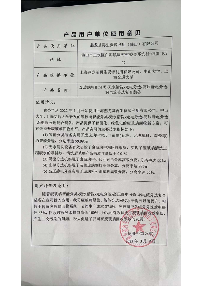废玻璃回收仪器装备用户单位使用意见-佛山公司