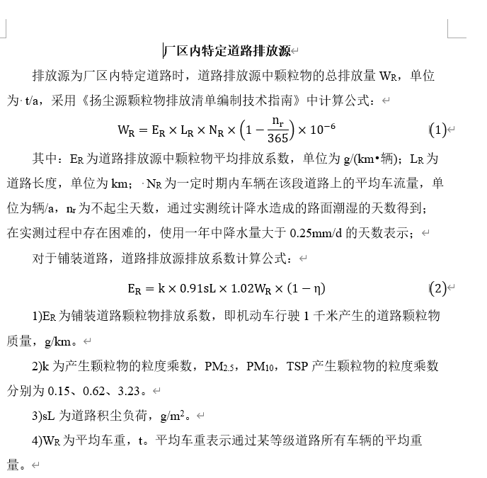 排放源为厂区内特定道路时,道路排放源中颗粒物的总排放量WR,单位为 t/a,采用《扬尘源颗粒物排放清单编制技术指南》中计算公式