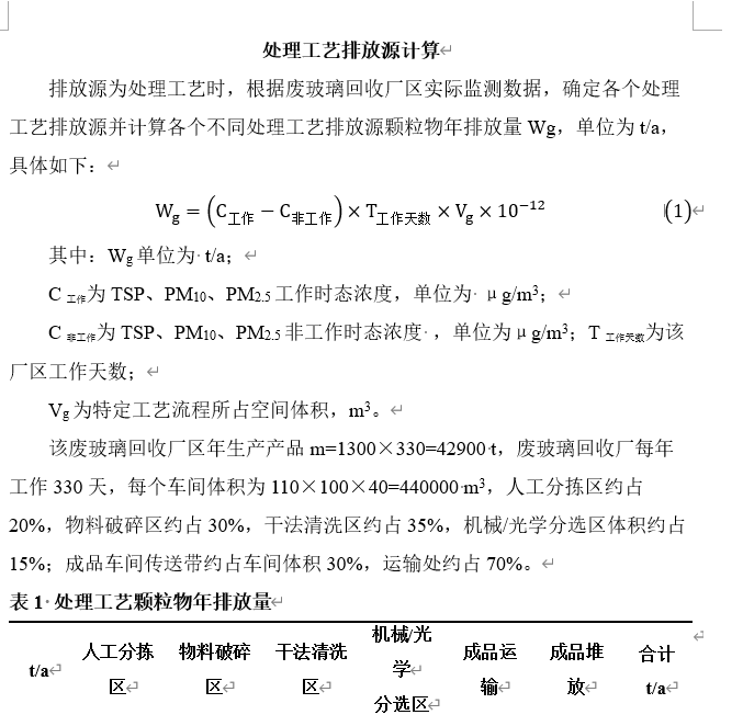 排放源为处理工艺时,根据废玻璃回收厂区实际监测数据,确定各个处理工艺排放源并计算各个不同处理工艺排放源颗粒物年排放量Wg,单位为t/a,具体如下