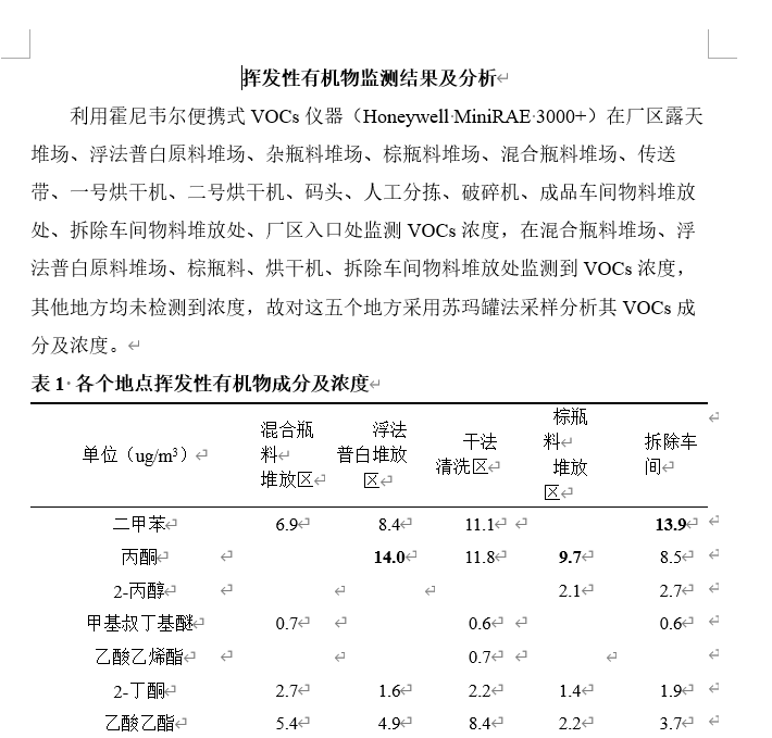 利用霍尼韦尔便携式VOCs仪器(Honeywell MiniRAE 3000+)在厂区露天堆场、浮法普白原料堆场、杂瓶料堆场、棕瓶料堆场、混合瓶料堆场、传送带、一号烘干机、二号烘干机、码头、人工分拣、破碎机、成品车间物料堆放处、拆除车间物料堆放处、厂区入口处监测VOCs浓度