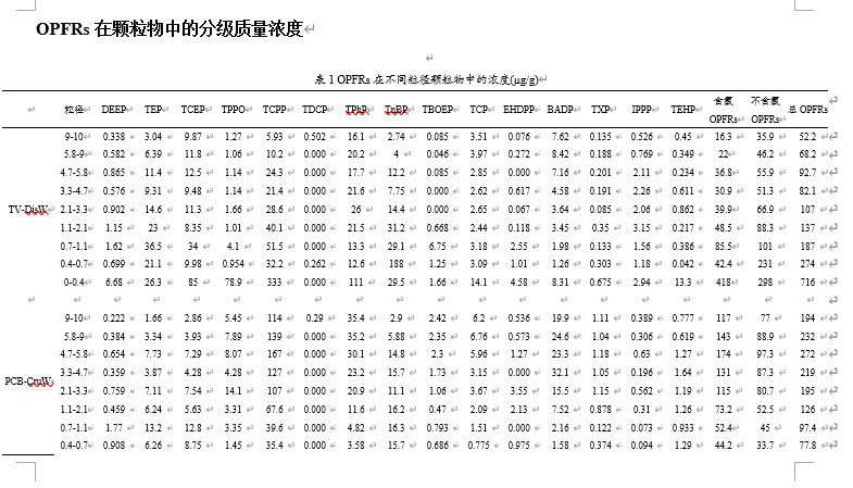 TV-DisW、PCB-CruW、SE-DisW和PCB-TherW中不同粒径颗粒物中的∑OPFRs浓度范围为 52.2-716 µg/g、77.8-252 µg/g、277-2910 µg/g和427-9720 µg/g。