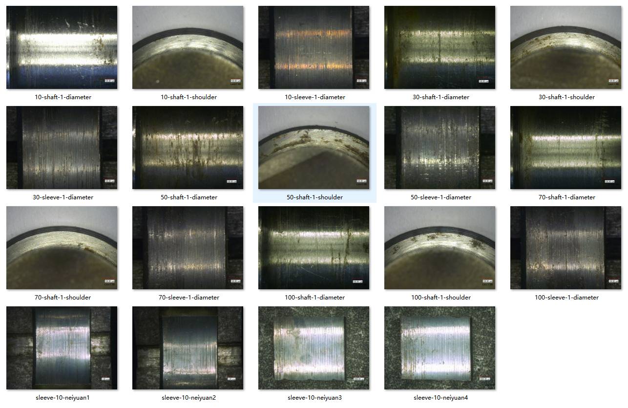 本条数据采用的设备为keyence公司生产的VHX-600E型超景深显微镜,放大倍数为20x,观察对象为小尺寸试件的配合部位的表面宏观形貌,主要的部位有轴径的过盈配合表面、轴肩接触表面以及轴套的配合表面。通过观察可以确定试件在不同旋转次数下的表面损伤情况,确定损伤的部位以便进一步观测。