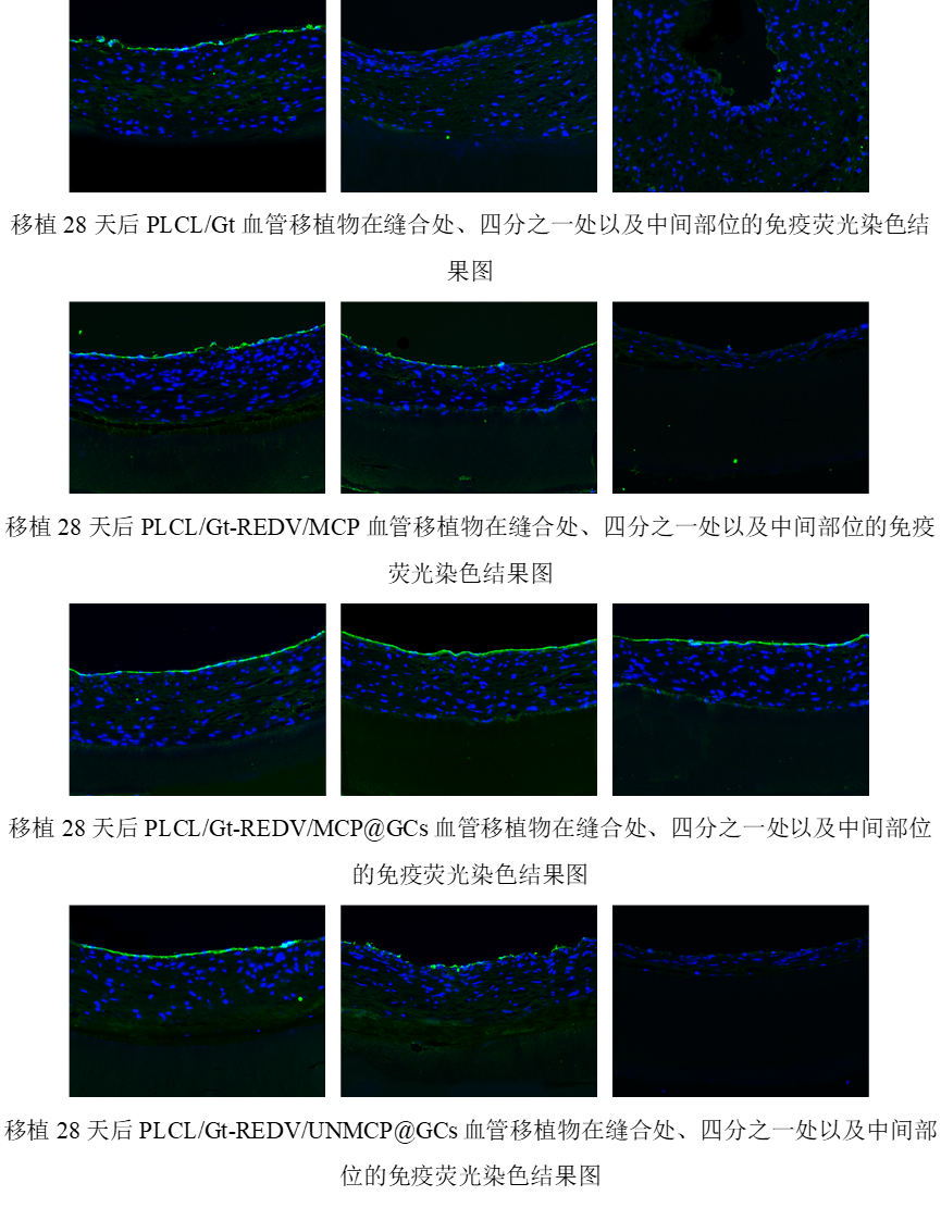 只有PLCL/Gt-REDV/MCP@GCs组从缝合处到血管移植中间部位形成了完整正常的内皮层,其他组无法实现如此快速的内皮化。这主要是由于PLCL/Gt-REDV/MCP@GCs血管移植能够促进HUVECs的粘附、迁移和增殖,利于实现快速内皮化。