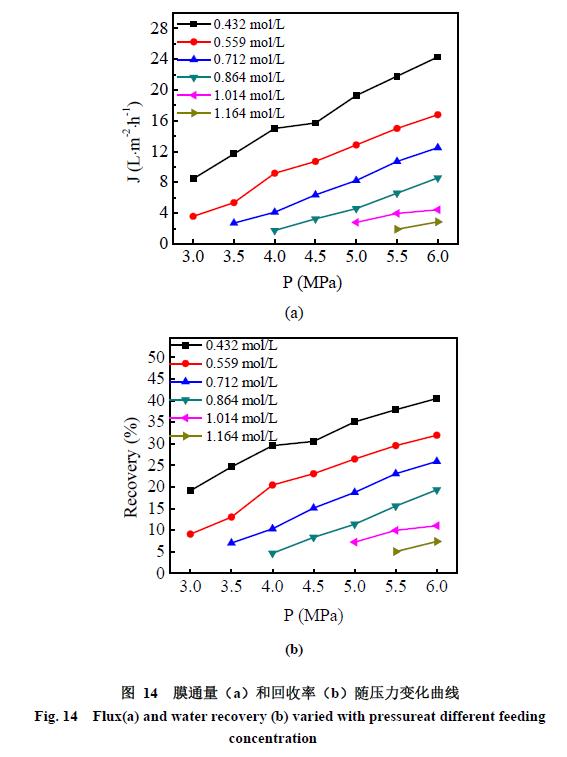 说明 : 考察了反渗透膜通量和回收率随压力和进液浓度的变化