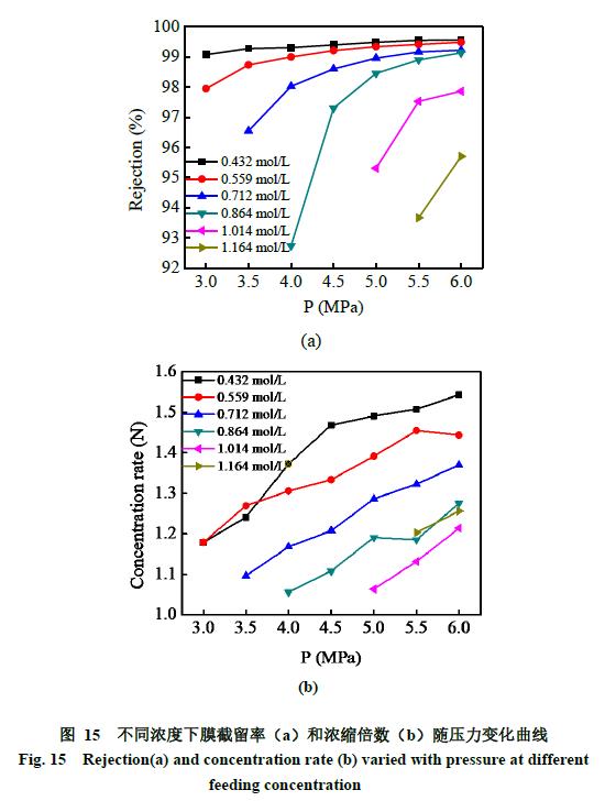 说明 : 考察了反渗透膜截留率和浓缩倍数随压力和进料浓度变化