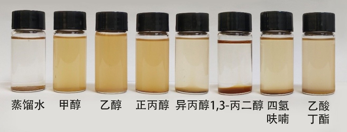 The refined lignin was dispersed into eight different solvents, distilled water, methanol, ethanol, n-propanol, isopropanol, 1, 3-propanediol, tetrahydrofuran and butyl acetate, in a ratio of 1/1000. Under normal temperature conditions, ultrasonic dispersion with a frequency of 80 Hz was performed for 20 min, and the dispersion results were recorded with a mobile phone, as shown in the figure.