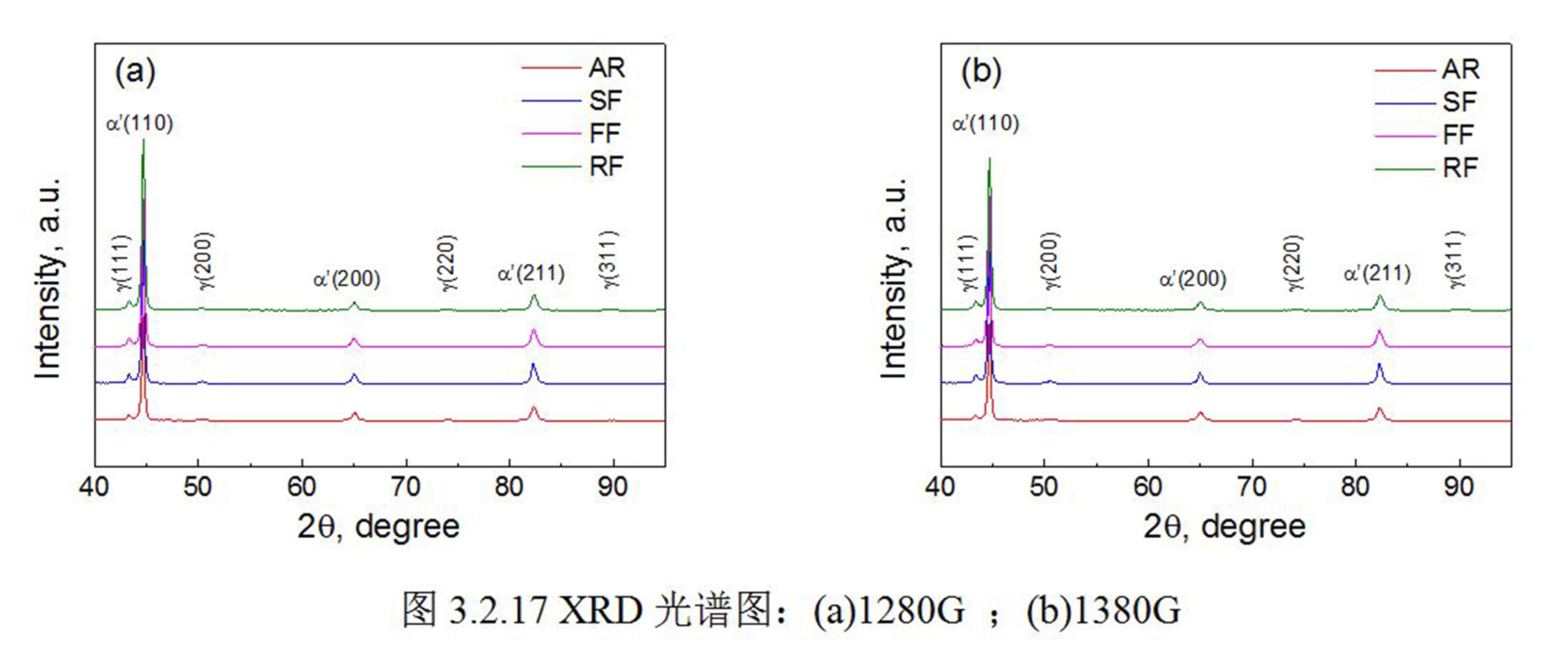 说明 : 展示了1280G和1380G贝氏体钢轨的XRD光谱图。