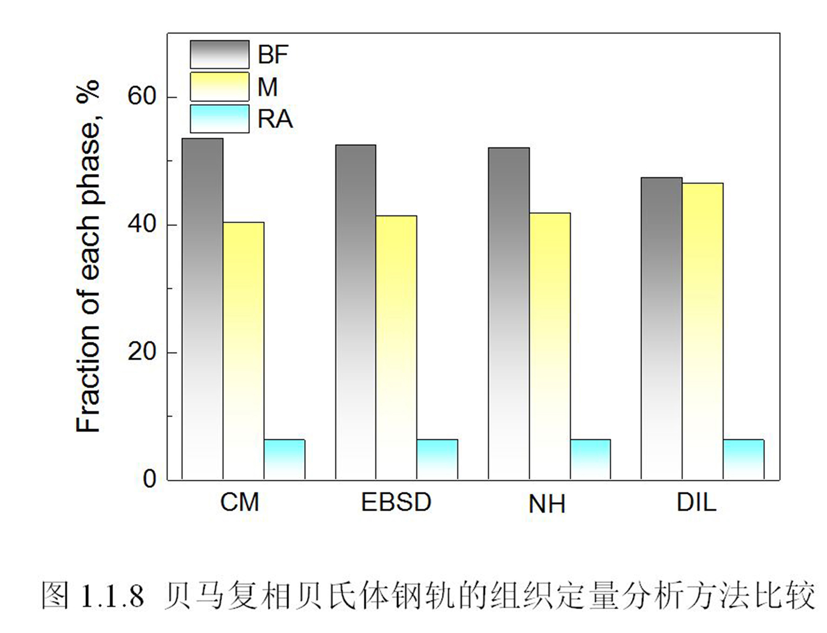 说明 : 对比了几种不同的测试方法给出的贝马复相贝氏体钢轨的组织分数占比。