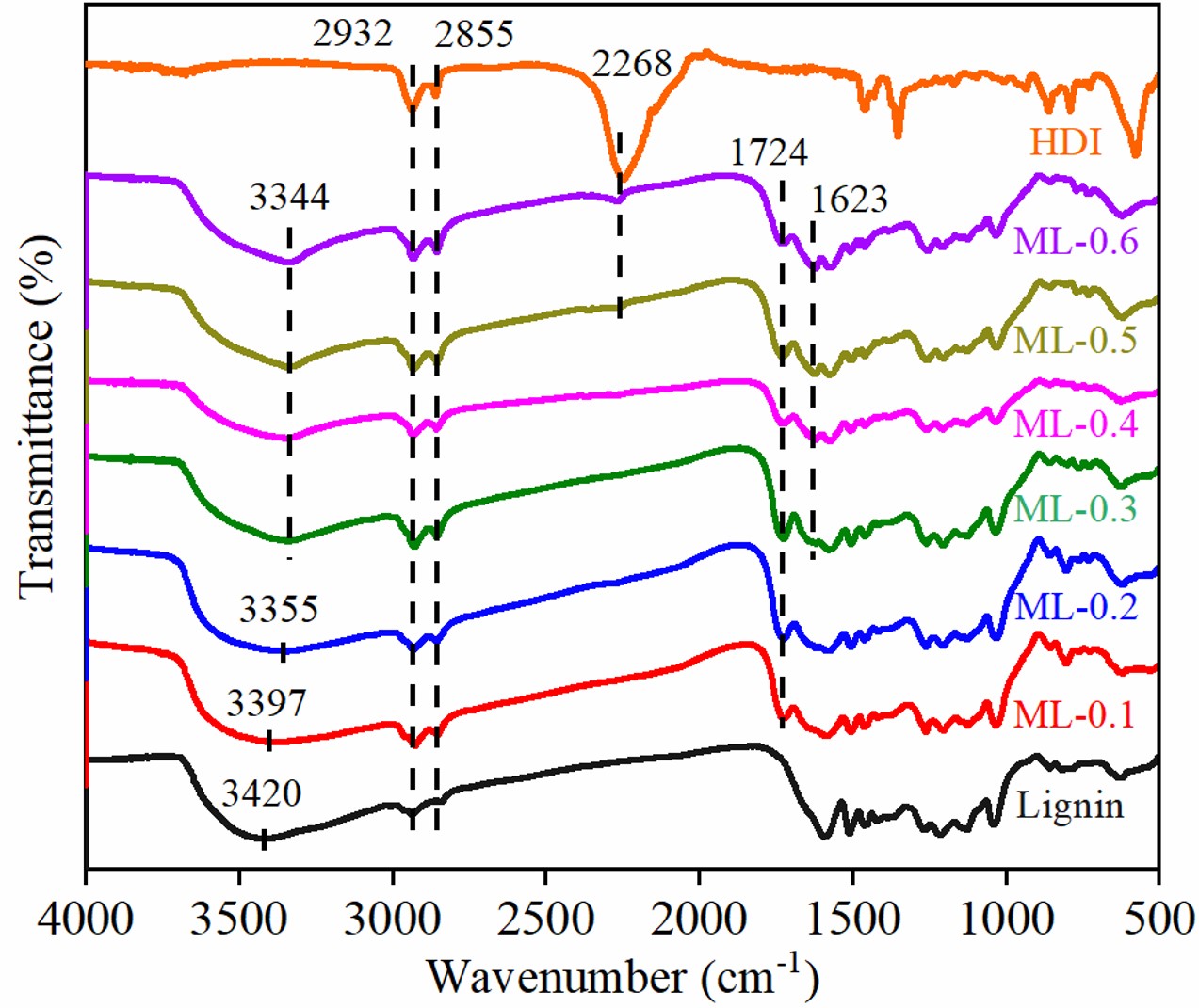 使用红外光谱仪对制备得到的木质素及改性木质素化学结构进行分析。木质素购自TCI公司,取四氢呋喃、木质素以及一定量的HDI加入配有氮气保护的三口烧瓶中,搅拌,室温下自然风干,再烘干,得到改性木质素。