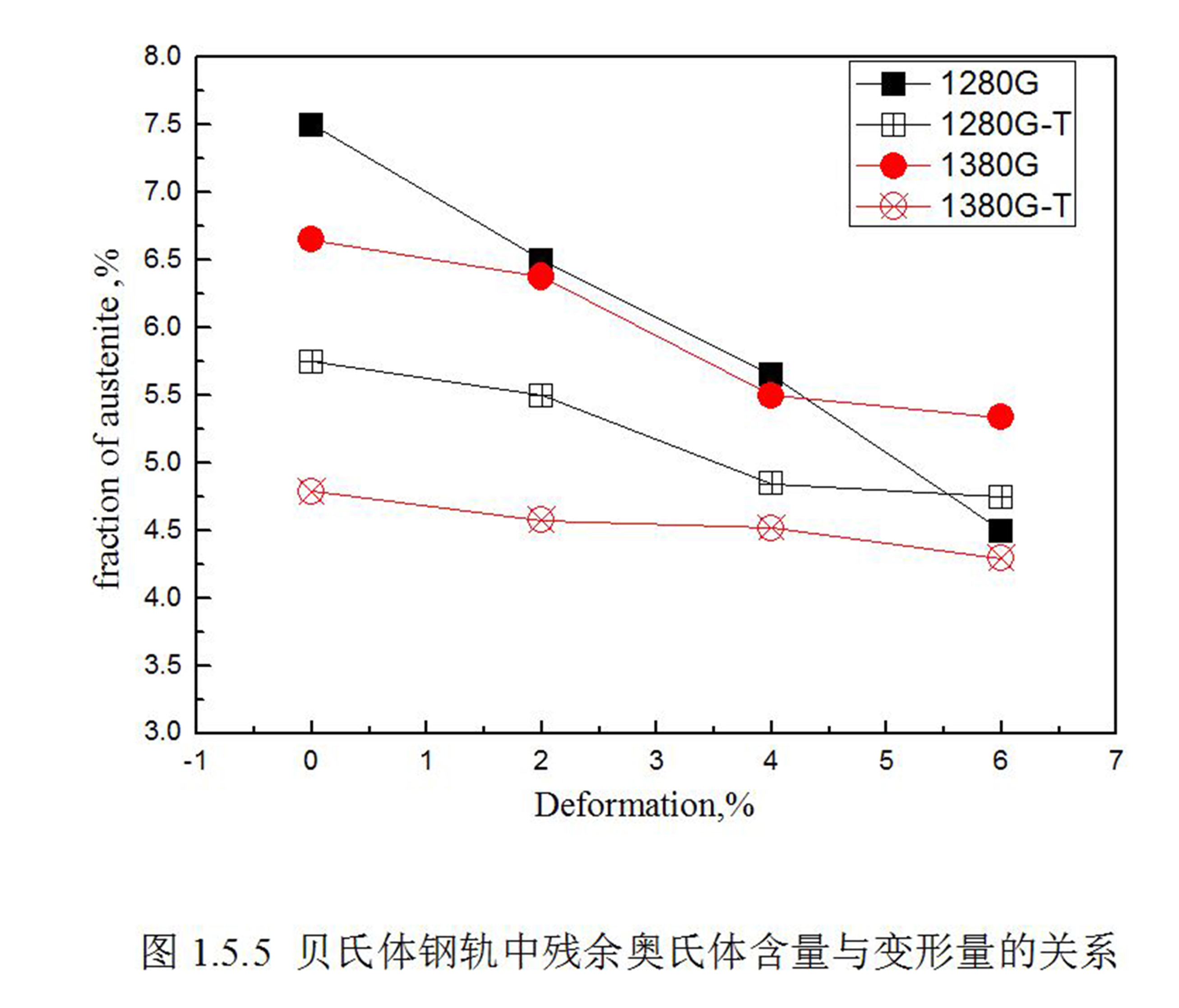 说明 : 给出了1280G和1380G贝氏体钢轨中残余奥氏体含量随着应变量的变化规律。