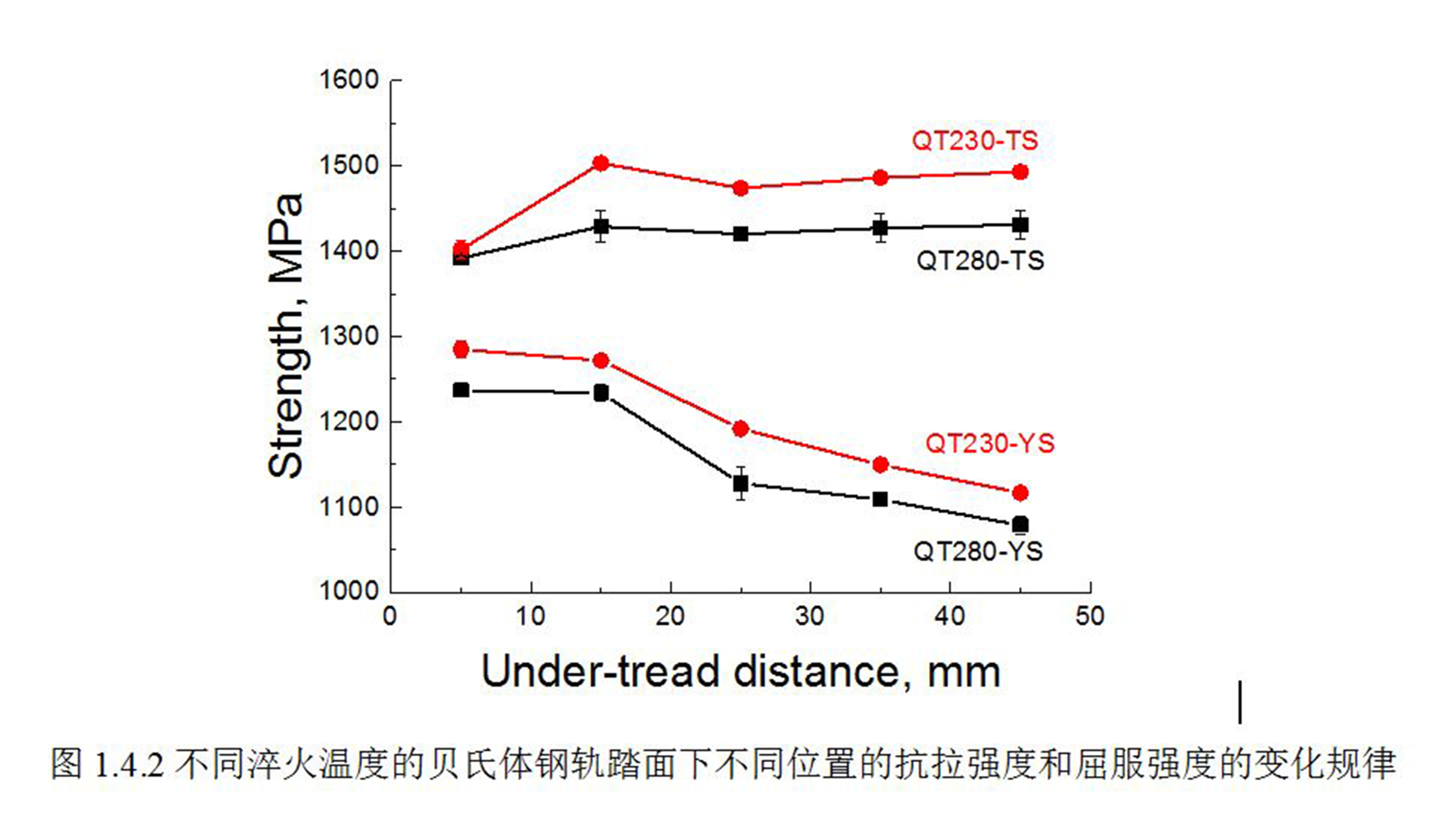 说明 : 描述了不同淬火温度制备的贝氏体钢轨踏面下不同位置的抗拉强度和屈服强度变化规律。