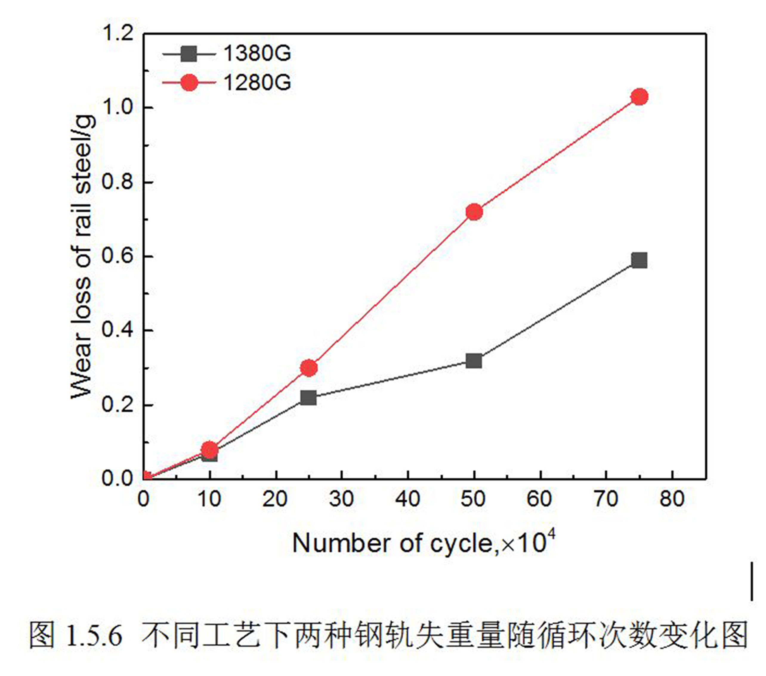 说明 : 描述了不同工艺下两种钢轨试样失重量随循环次数累积的变化。