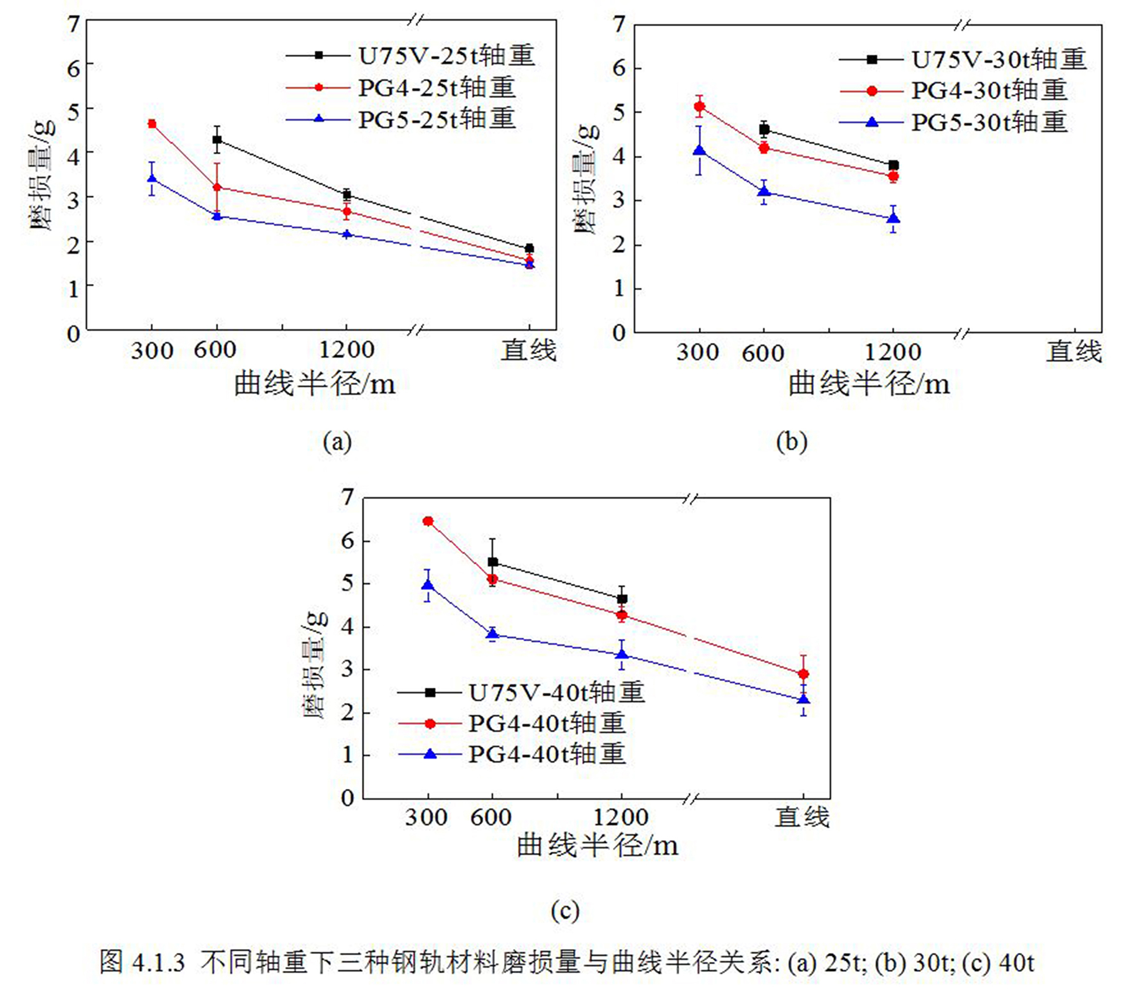 说明 : 描述了不同轴重下U75V、PG4、PG5三种钢轨材料的磨损量与曲线半径关系。