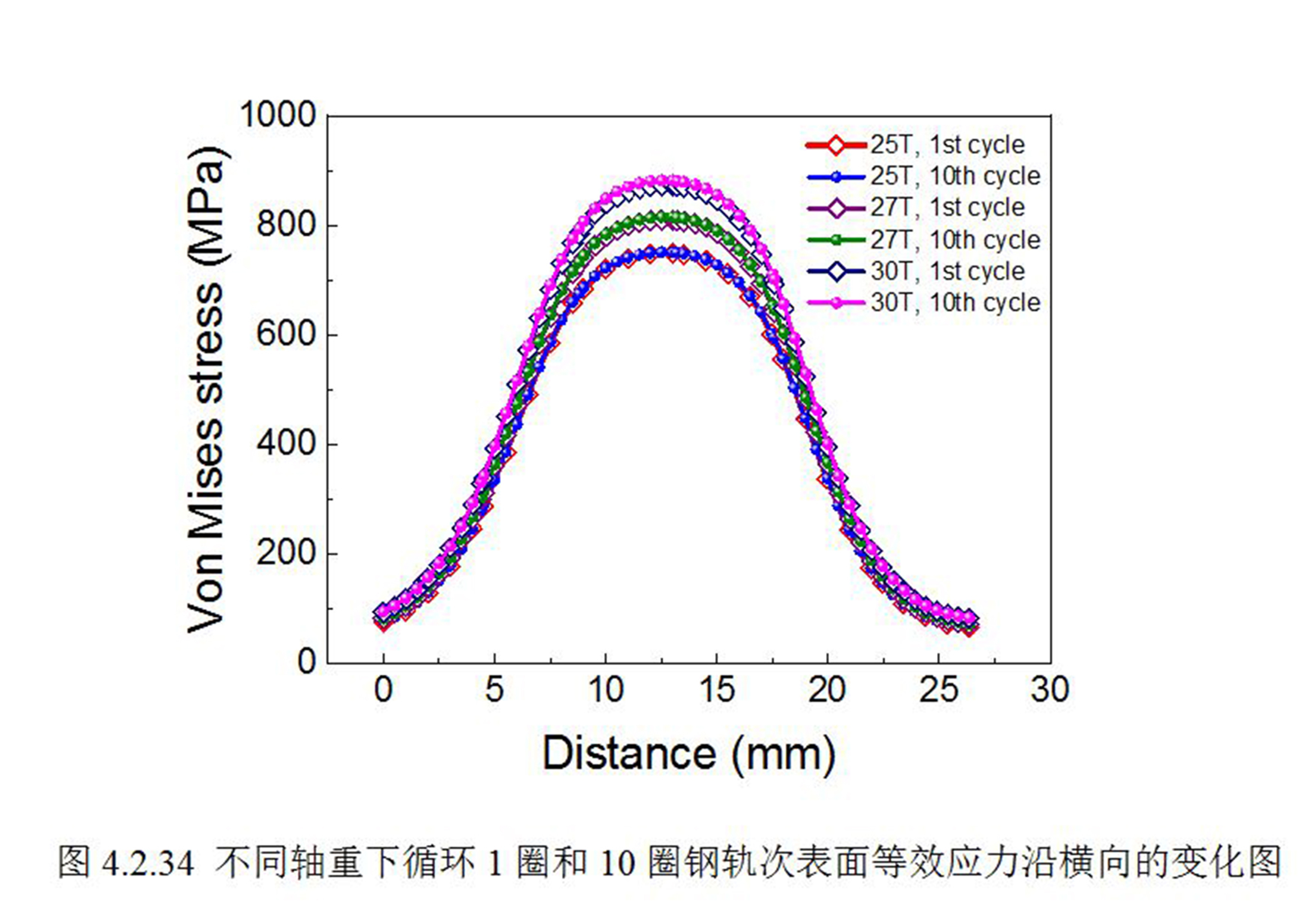 说明 : 描述了不同轴重下1圈和10圈钢轨次表面等效应力沿横向的变化。