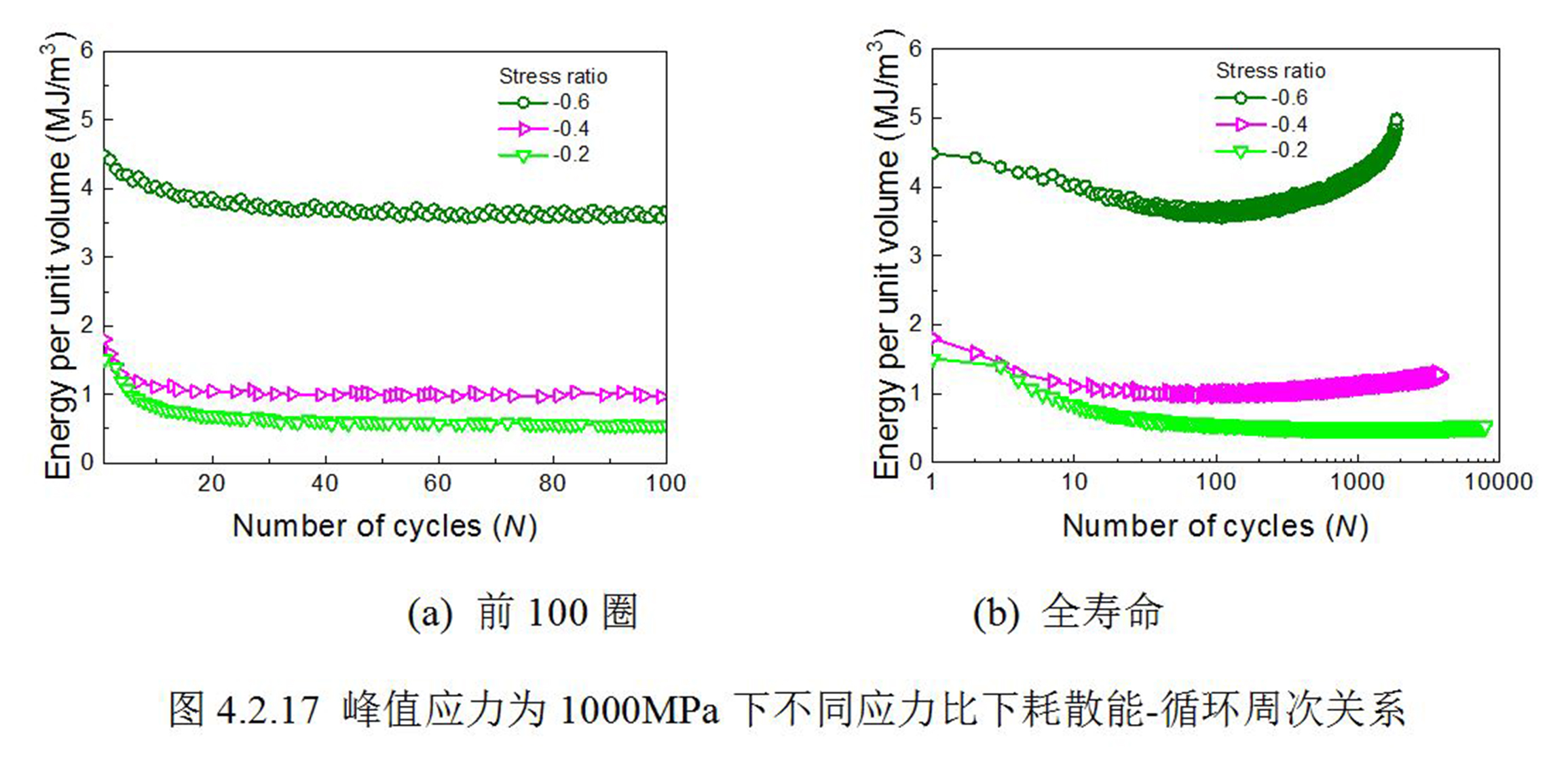 说明 : 描述了峰值应力为1000MPa下不同应力比下耗散能与循环周次的关系。