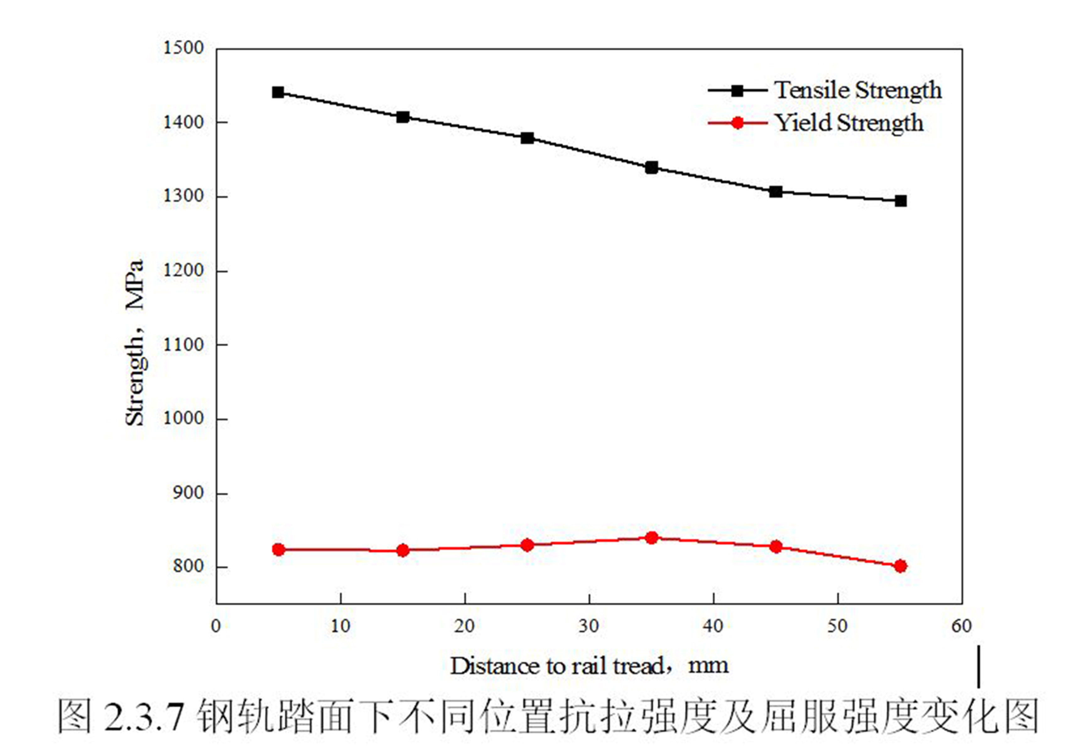 英文名称 : Variation diagram of tensile strength and yield strength at different positions under rail tread