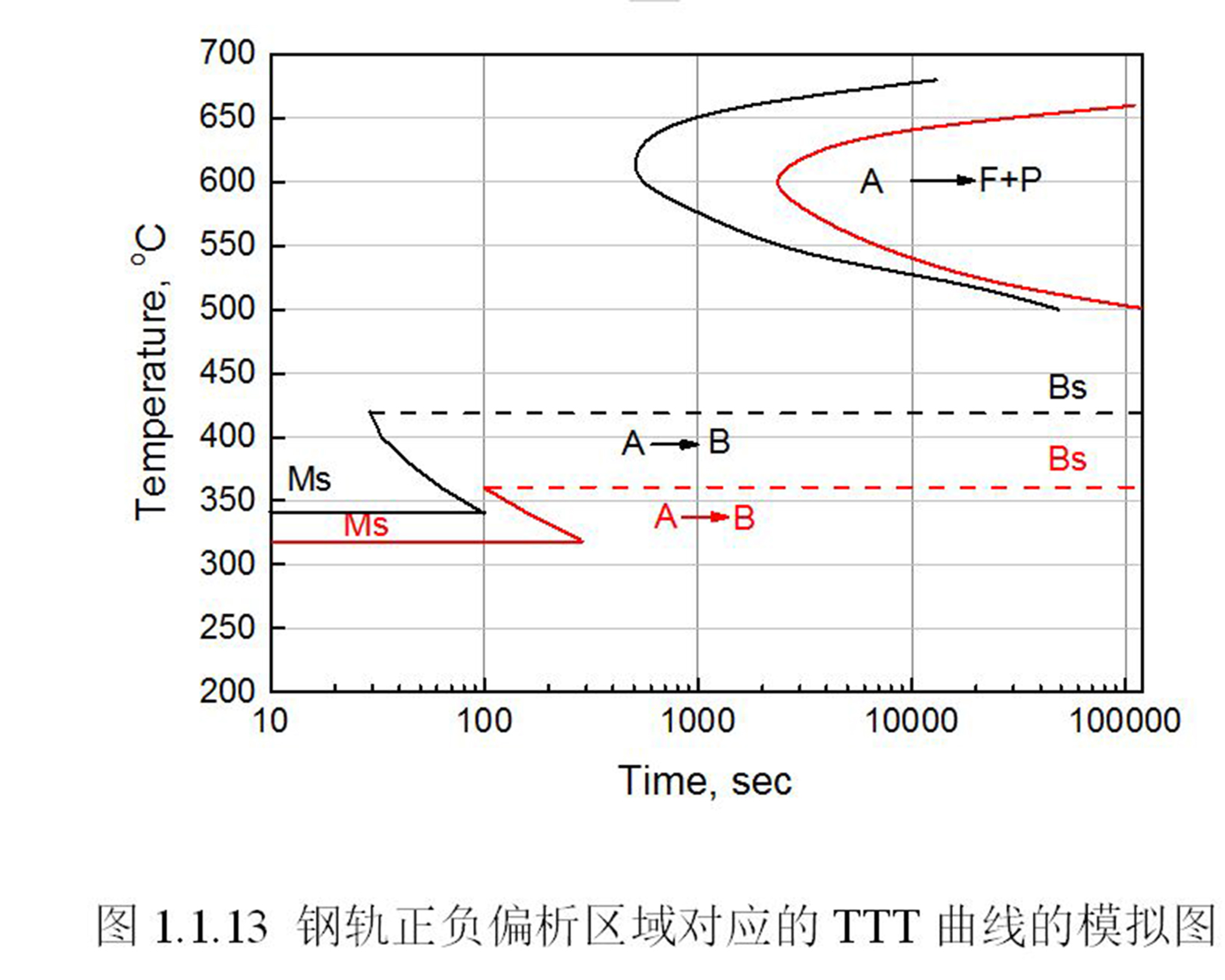 名称 : 钢轨正负偏析区域对应的TTT曲线的模拟图