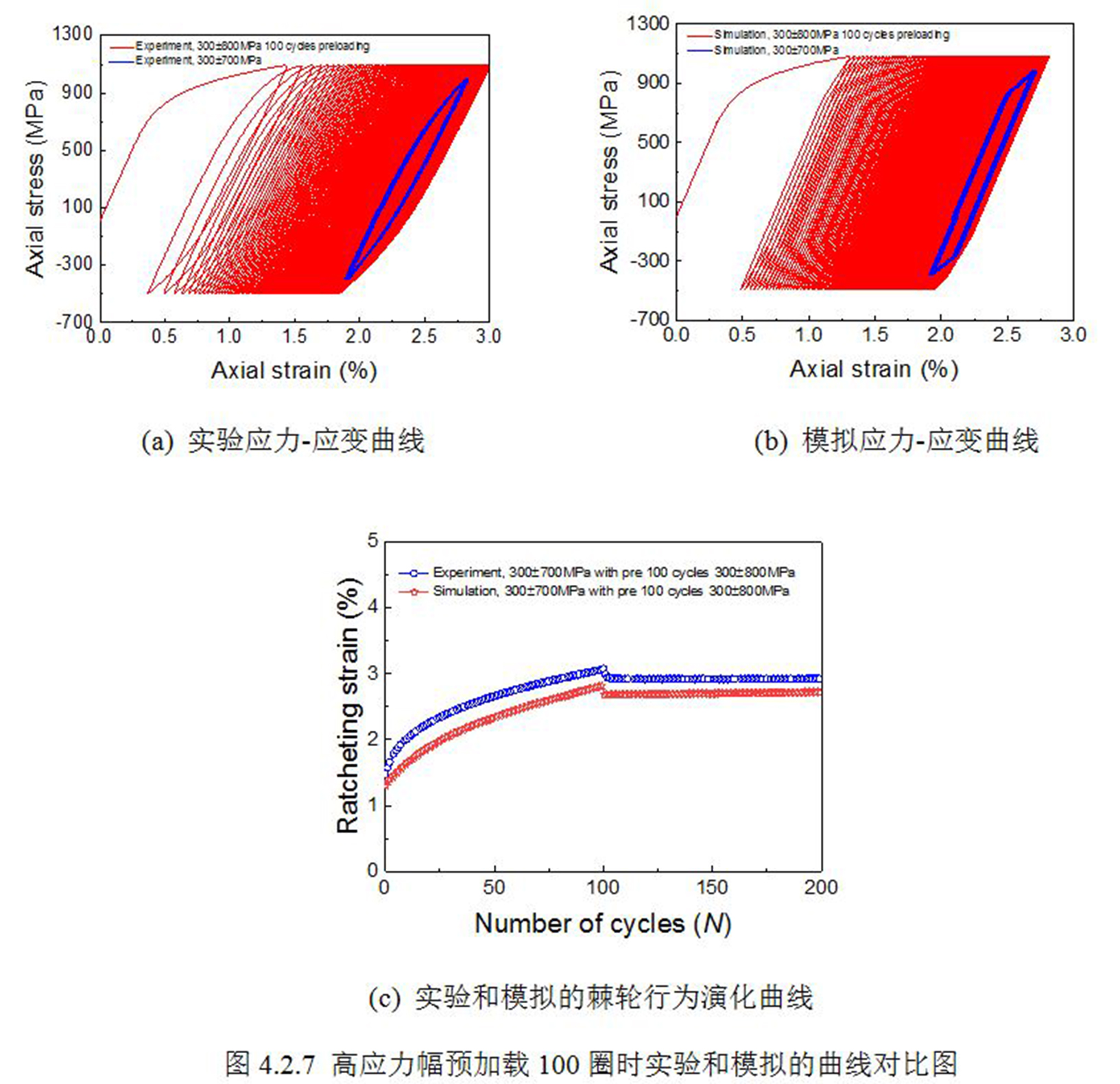 英文说明 : The comparison between experimental and simulated curves under 100 cycles of high stress amplitude preloading is described.