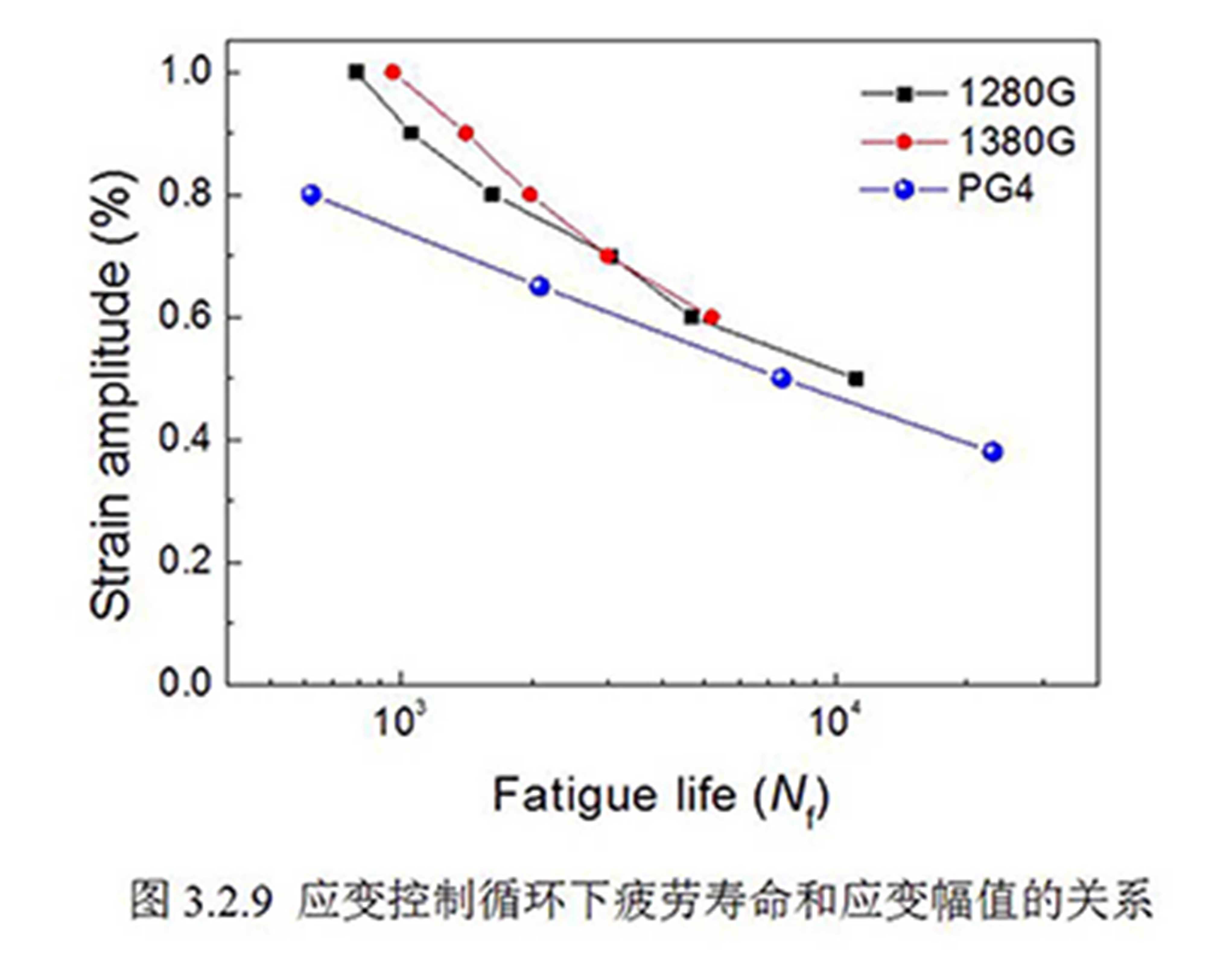 说明 : 描述了1280G、1380G和PG4三种钢轨在应变控制循环下疲劳寿命和应变幅值的关系。