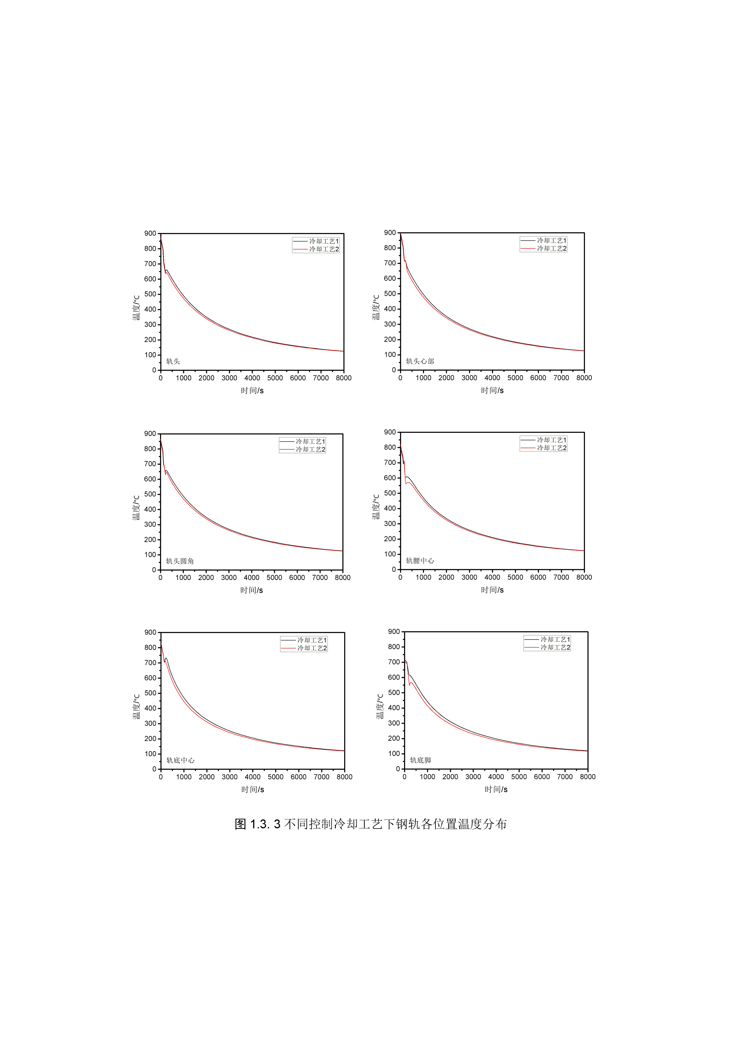 名称 : 不同控制冷却工艺下钢轨各位置温度分布