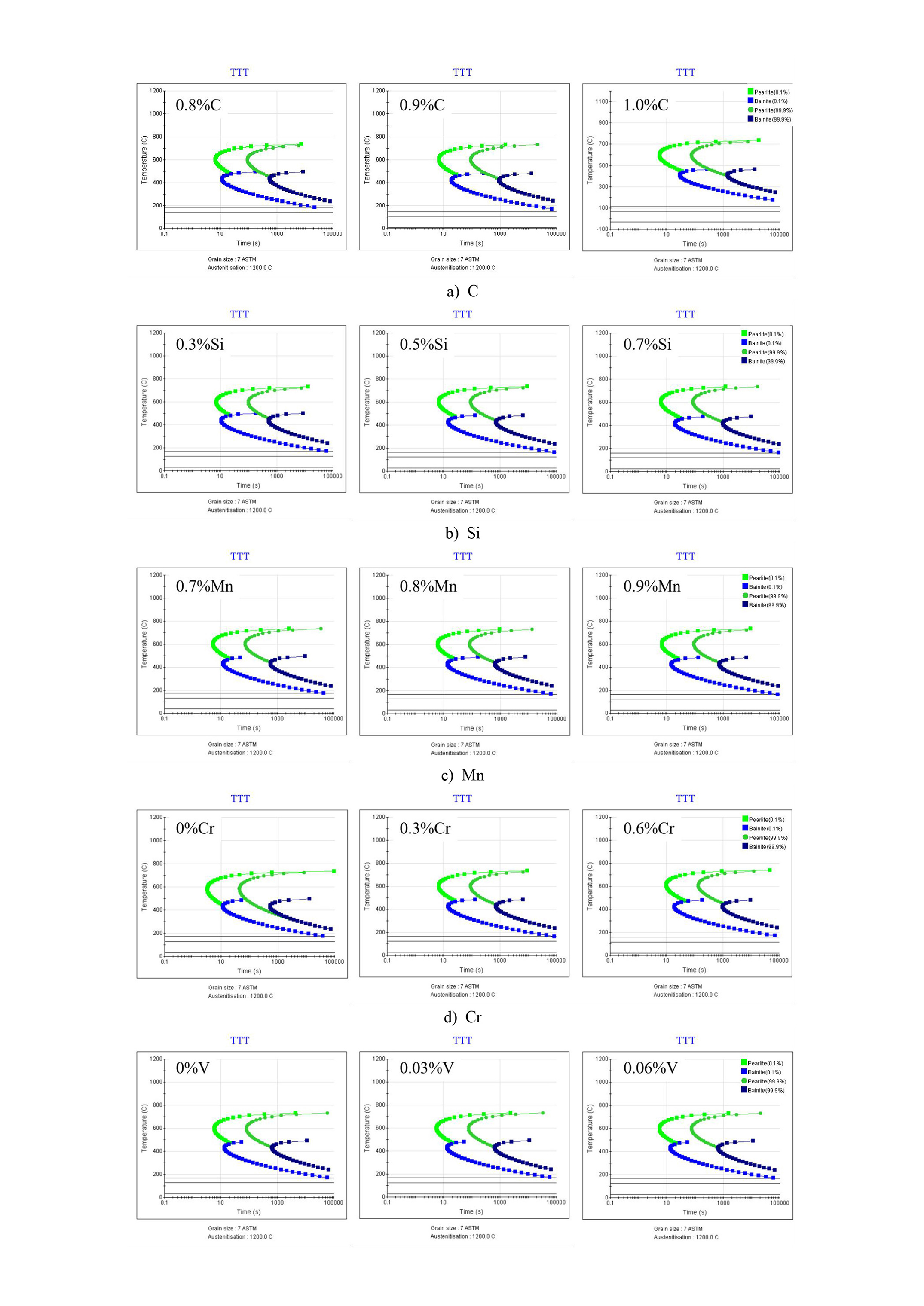 说明 : 展示了不同的碳及合金元素含量下,钢轨的等温转变TTT曲线。