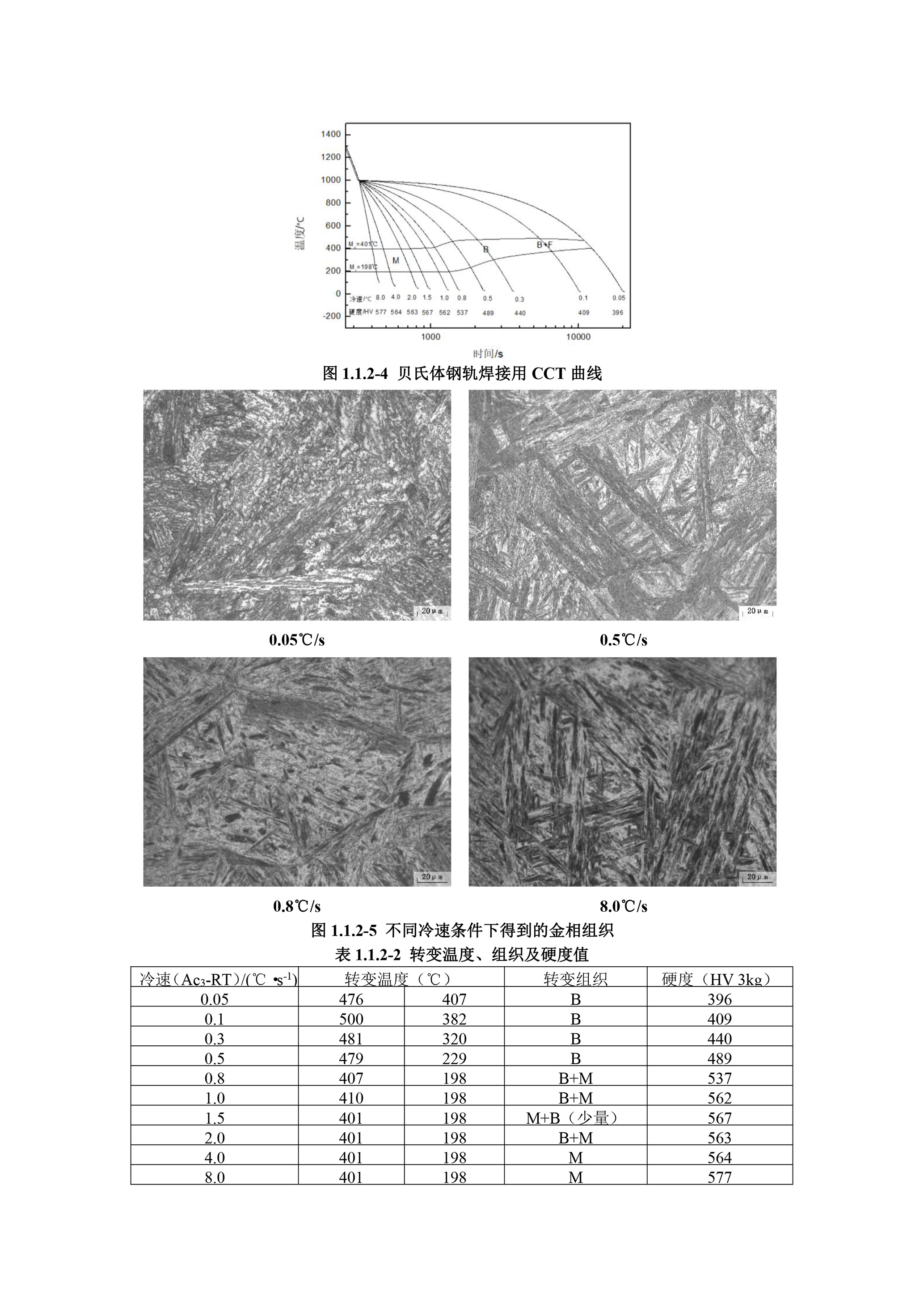 英文说明 : The CCT curve for welding bainitic steel and the metallographic structure under different cooling rates are given.