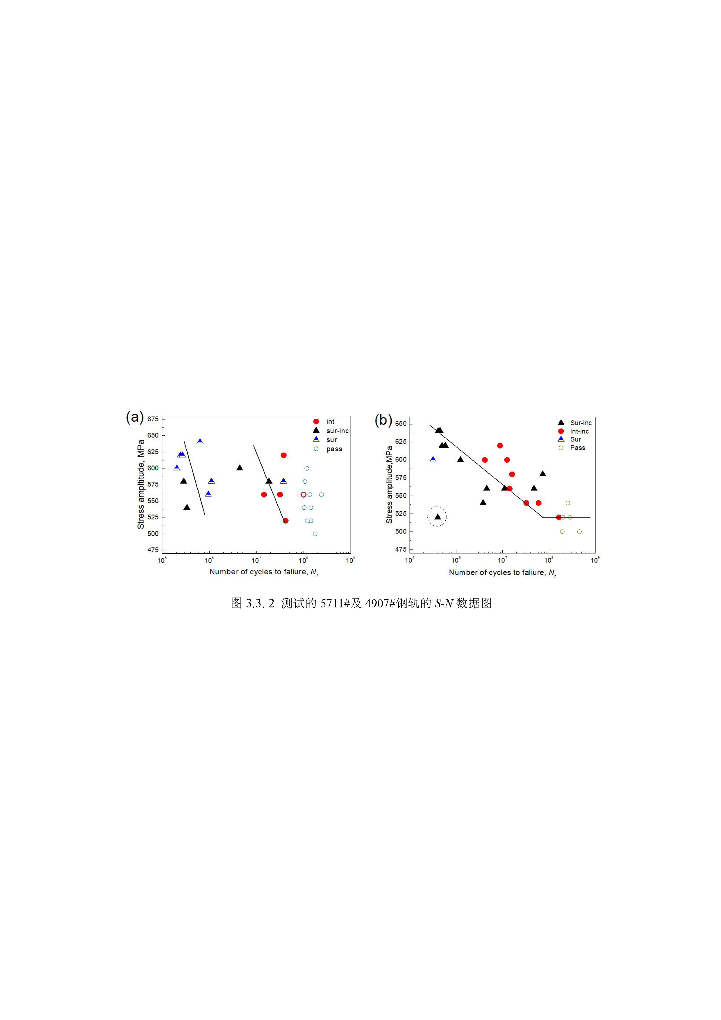 英文说明 : The S-N fatigue curves of samples at different positions of testing 5711# and 4907# rails are given.