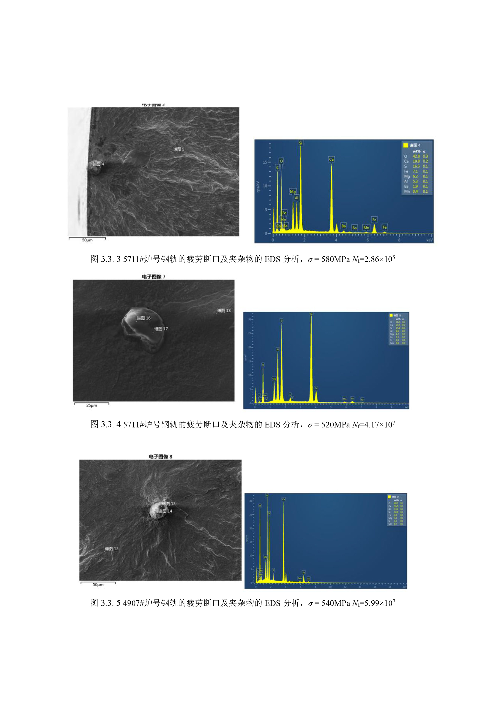 说明 : 给出了测试5711#和4907#钢轨试样疲劳断口形貌和夹杂物的EDS物相分析结果。