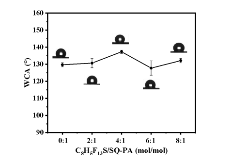 说明 : 不同摩尔比(C8H5F13S/SQ-PA)下 SQ-F/EA@FP 的 WCA