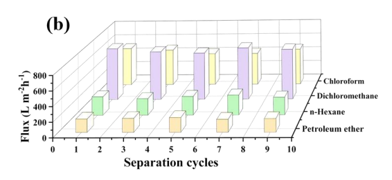 说明 : SQ-F/SH-SiO2/EA@FP在不同循环次数和不同油水混合物下的通量