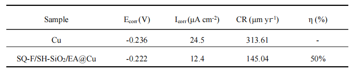 说明 : 原始铜箔和 SQ-F/SH-SiO2/EA@Cu 在 3.5 wt% NaCl 溶液中浸泡 1 d 的 Tafel 极化参数