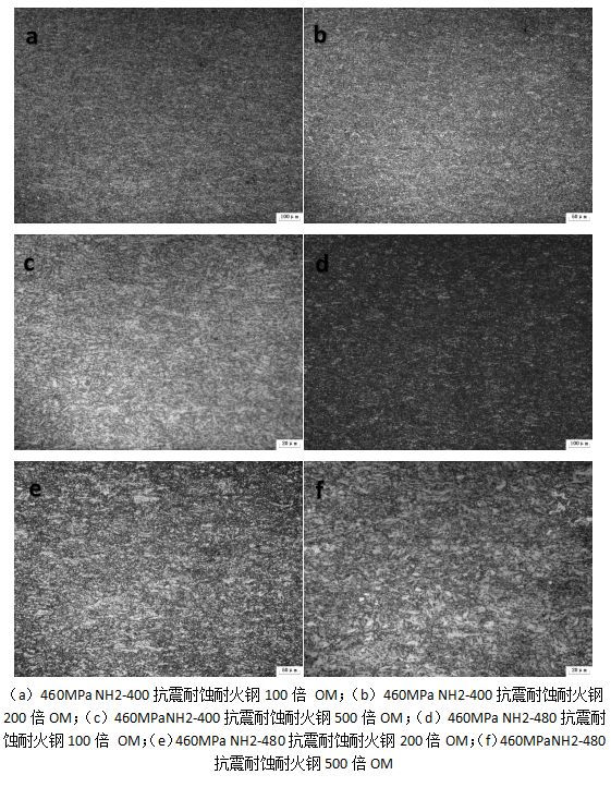 在本研究中,先在预磨机上进行预磨,然后在150、320、600和1000号砂纸上依次水磨,在抛光机上进行机械抛光,抛光后的试样置于4 ml 硝酸(HNO3) + 96 ml 无水乙醇(CH3CH2OH)混合溶液浸蚀10~20 s,在Olympus GX53光学显微镜中观察热轧态金相组织,NH2-400微观组织为粒状贝氏体,NH2-480微观组织中出现了上贝氏体。