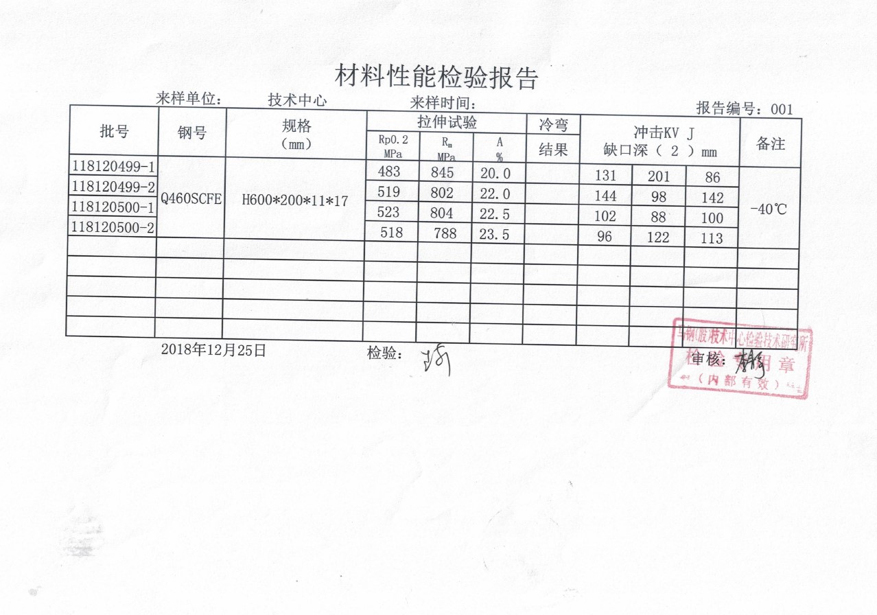 马鞍山钢铁股份有限公司对2018年12月和2021年5月生产的Q460SCFE耐火耐候H型钢进行了现场生产质检,规格为H600*200*11*17mm和H1046*351*55*99mm。分别进行了室温拉伸、弯曲试验、-40℃冲击试验以及厚度方向断面拉伸试验。各性能指标满足产品质量要求。